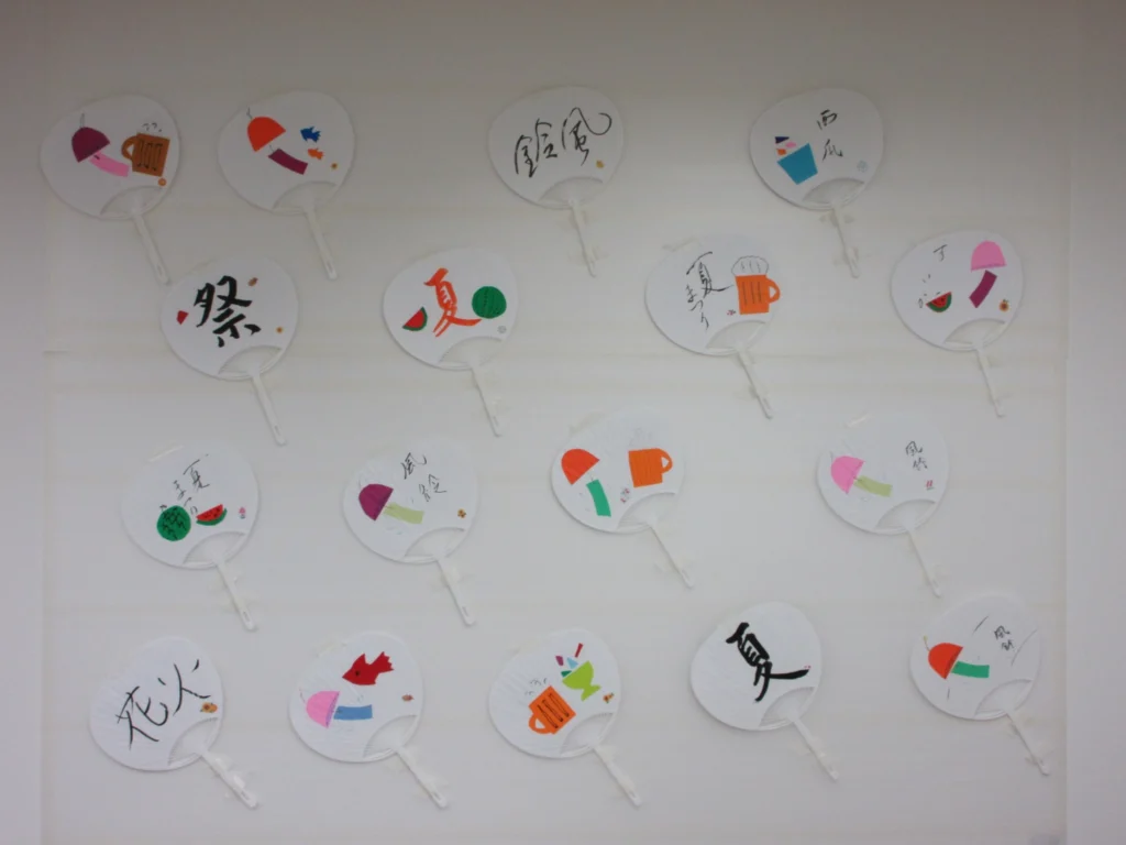 9月に入ってもまだ暑い中、作成した一部のうちわを館内に飾らせていただきました。来館されたお客様にも目で涼んでいただいています。ご入居者様と一緒に残暑を乗り切ります!!