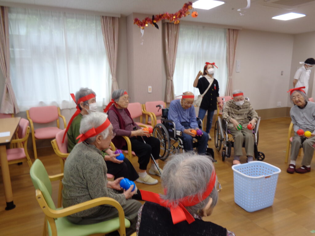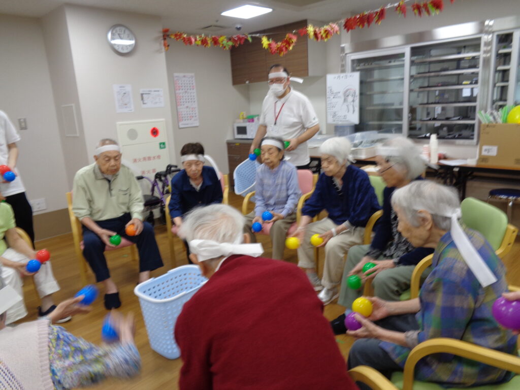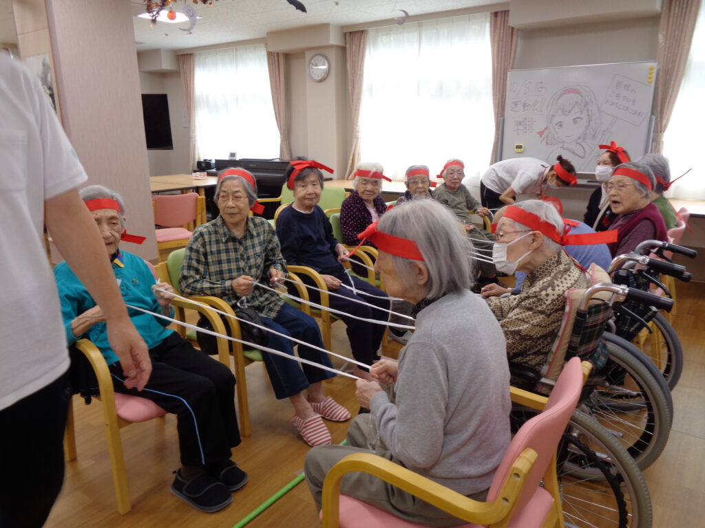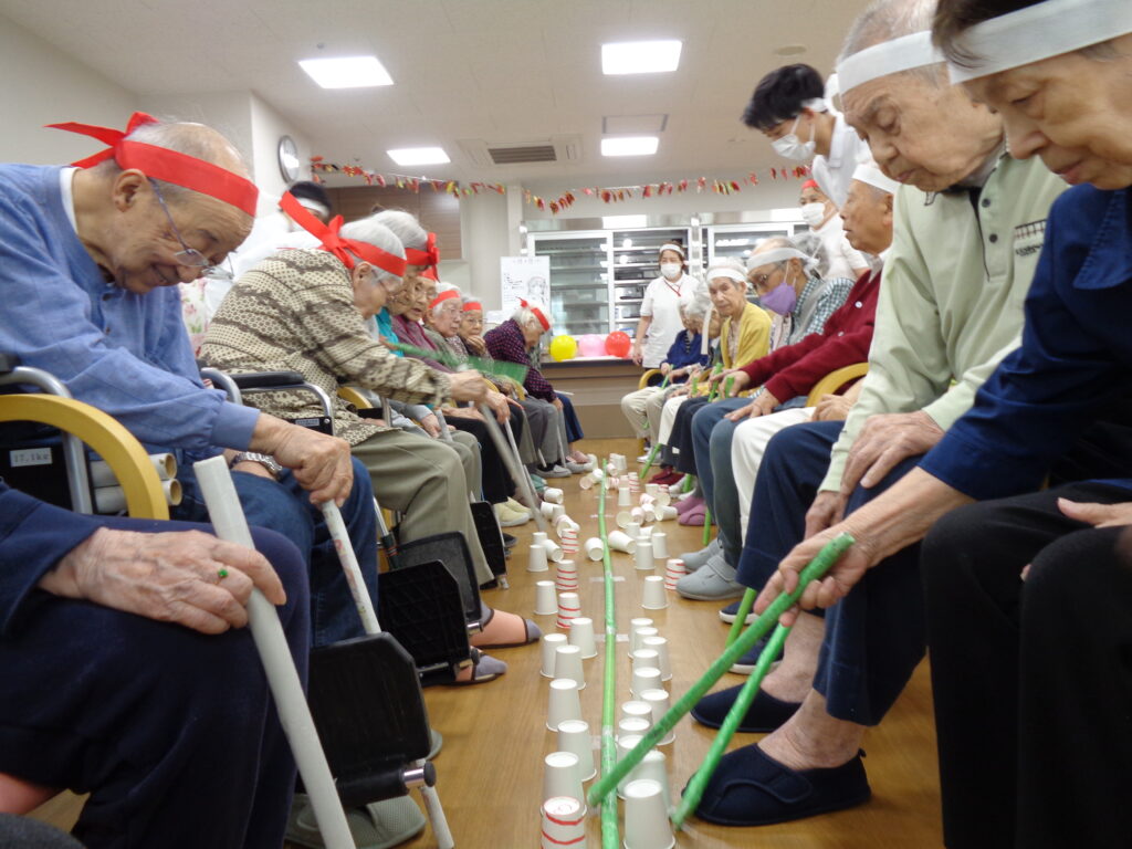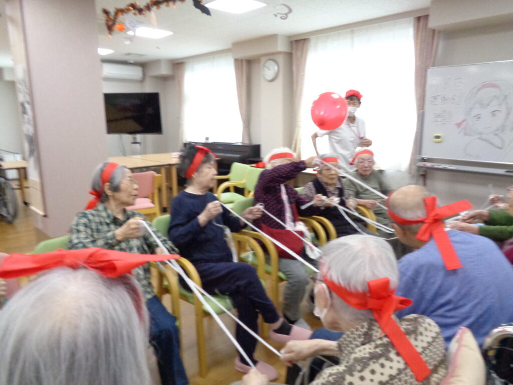 ベストライフ西馬込の運動会は、座ったままでも熱気ムンムン!紅白に分かれたご入居者様とご入居者様が、笑いあり涙(?)ありの三種目で大熱戦。