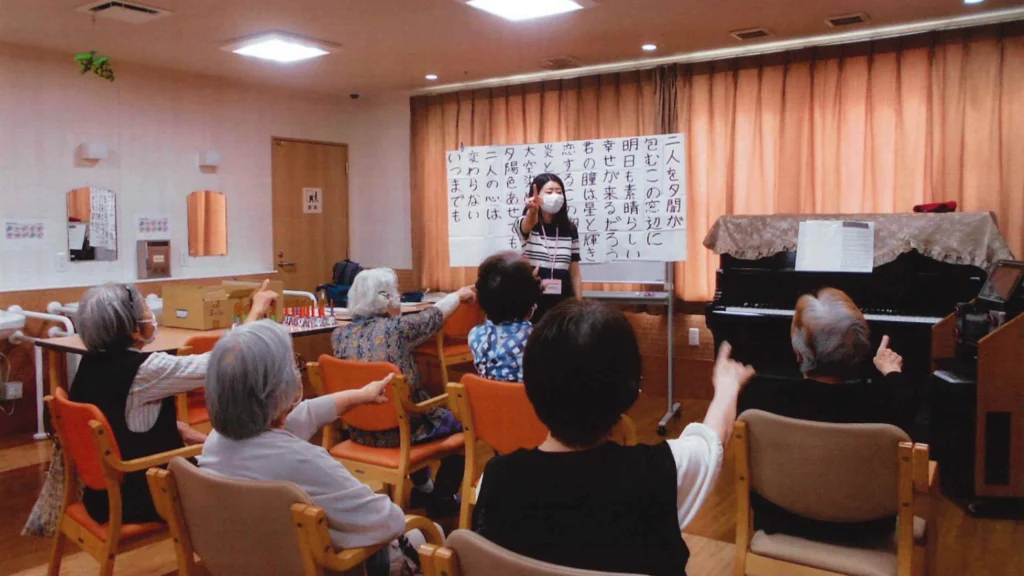 講師の方は、たくさんのご入居者様に声をかけながら、一緒に歌ったり楽器の演奏をしたりと盛り上げてくださいます。