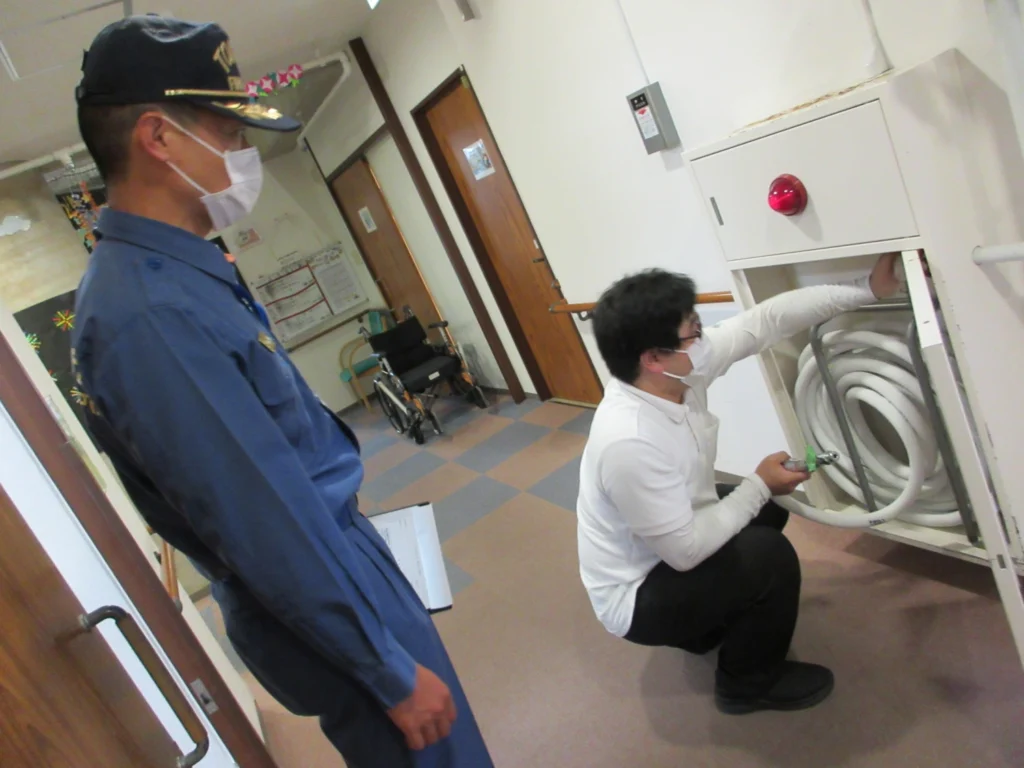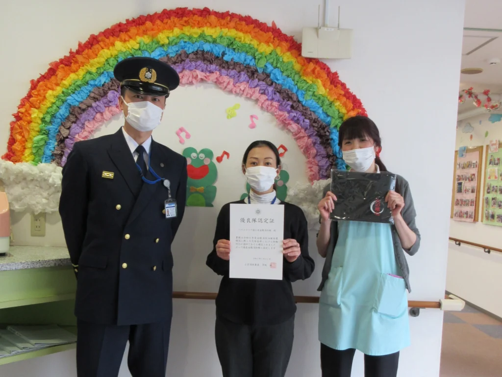 消防隊の方と一緒に消防訓練を実施し、「優良隊認定証」をいただきました。