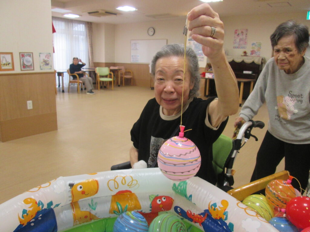 毎年恒例の『夏祭り』!今年も開催いたしました!!昨年は綿菓子屋さんが登場しましたが、今年はかき氷屋さんに加え、金魚すくいとヨーヨー釣りを楽しんでいただきました。かき氷では様々なシロップを用意し、「どれにしようかな~」と迷いながら楽しまれるご入居者様の姿も見られました。イートインコーナーを設けて、お好きなものを食べながらご入居者様同士での交流も生まれ、賑やかで楽しいひとときを過ごすことができました。