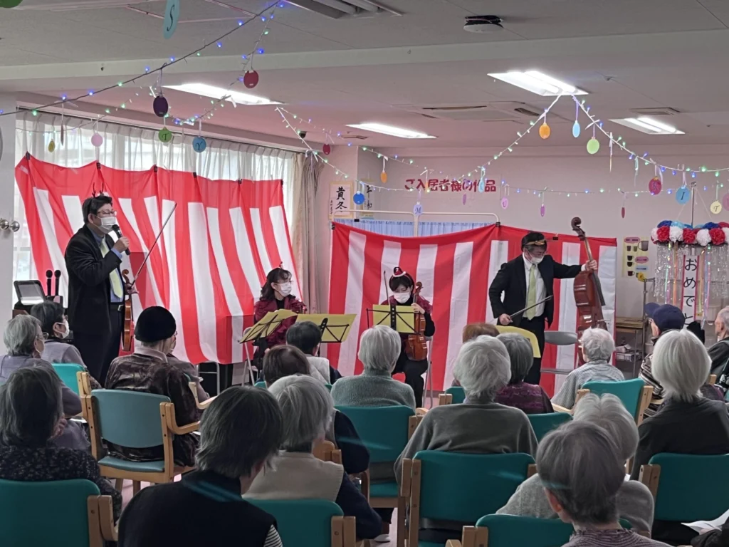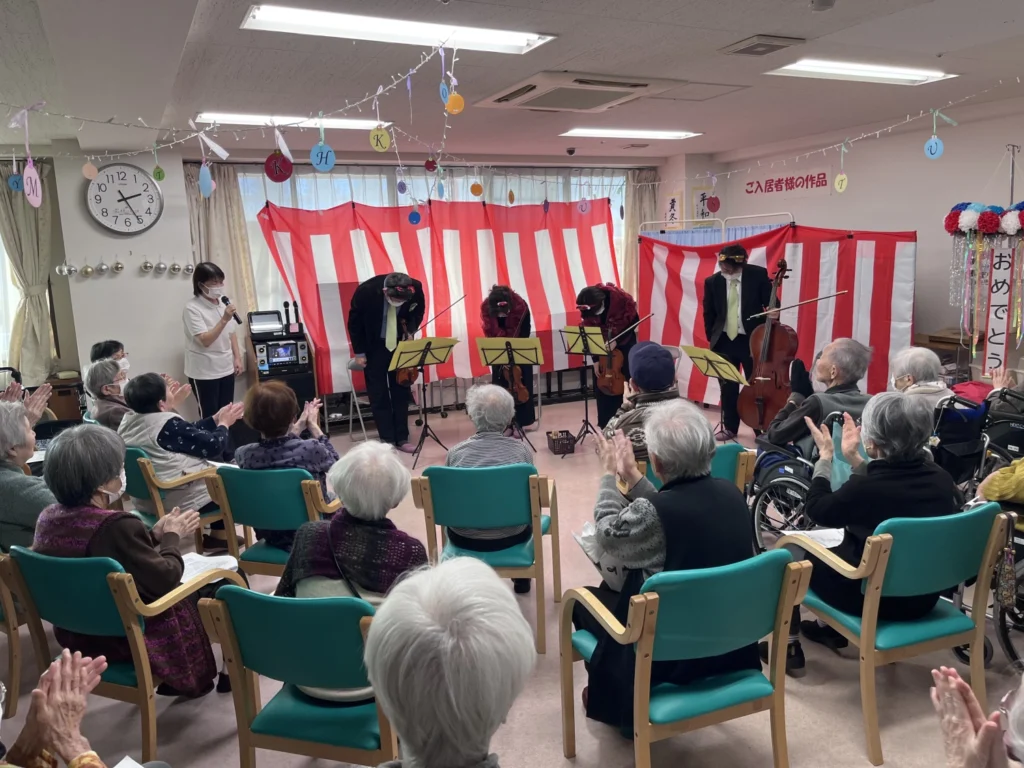 普段より少し豪華なお食事に、皆さまも舌鼓。ボランティアによる弦楽四重奏の演奏も楽しみました。中には、身体を動かして楽しむ曲もあり、和やかで楽しいひとときをお過ごしいただきました。