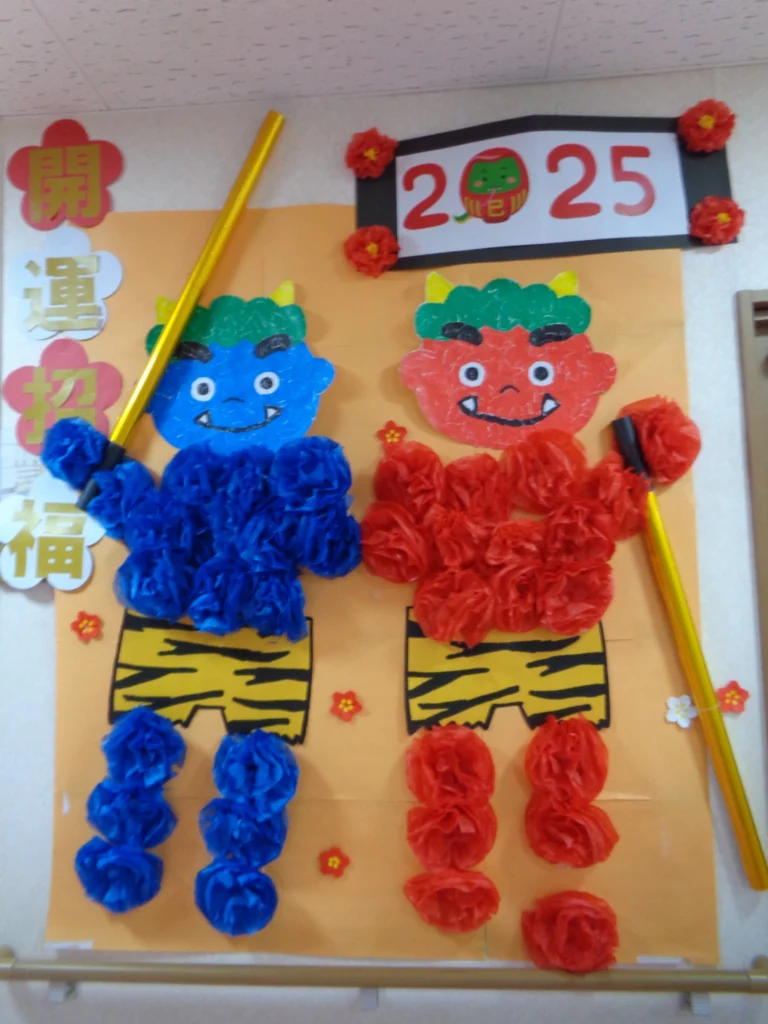 職員扮する赤鬼・青鬼が登場すると、ご入居の皆さまから笑い声とともに「鬼は外!福は内!!」の元気な掛け声が響き渡りました。豆の代わりにお手玉を使い、怪我のないように工夫しながら楽しく鬼退治をしていただきました。