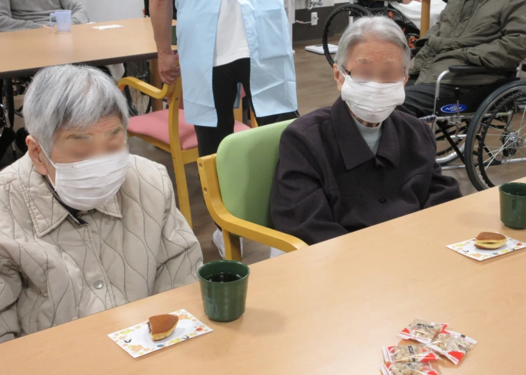 大きな声をあげて手を振り上げる職員の姿に、鬼も怖がって出てこられないほどの盛り上がりでした。豆まきのあとは、大きなどら焼きをいただき、笑顔あふれる楽しいひとときを過ごしました。