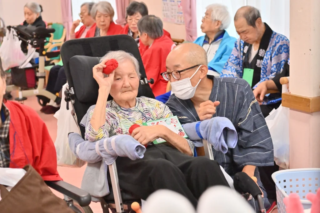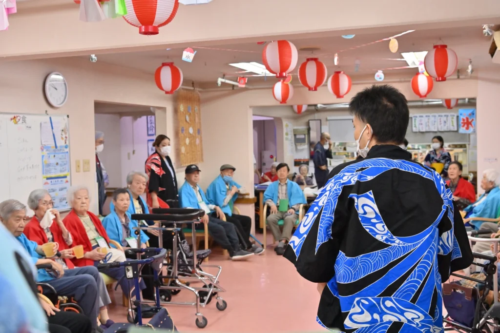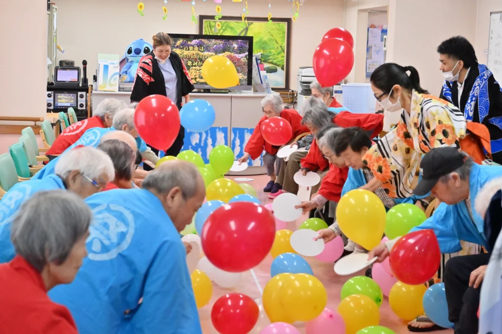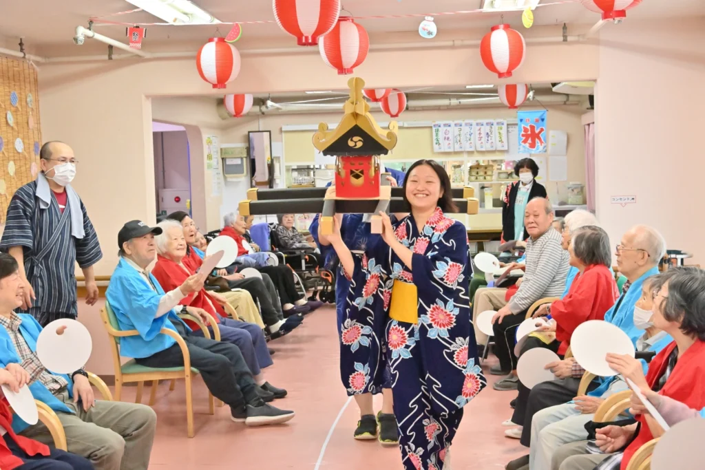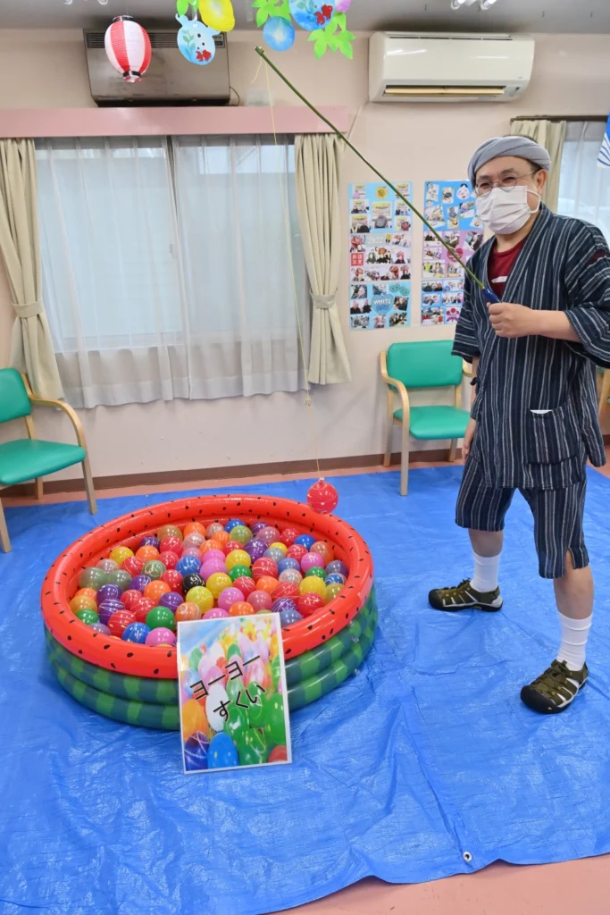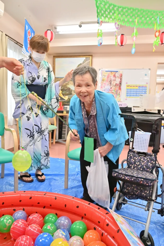 納涼祭は一日を通して行います。午前中は、催し物として『的当て』『ヨーヨー釣り』『お菓子つかみ取り』『アイスクリーム』を実施。昼食も「お祭りメニュ―」をご提供。午後は、お神輿練り歩きからの「ゲーム大会」とイベントが盛りだくさん。今年のゲームは『風船送り』でした。 ご入居者様だけでなく、職員も一緒に楽しみます