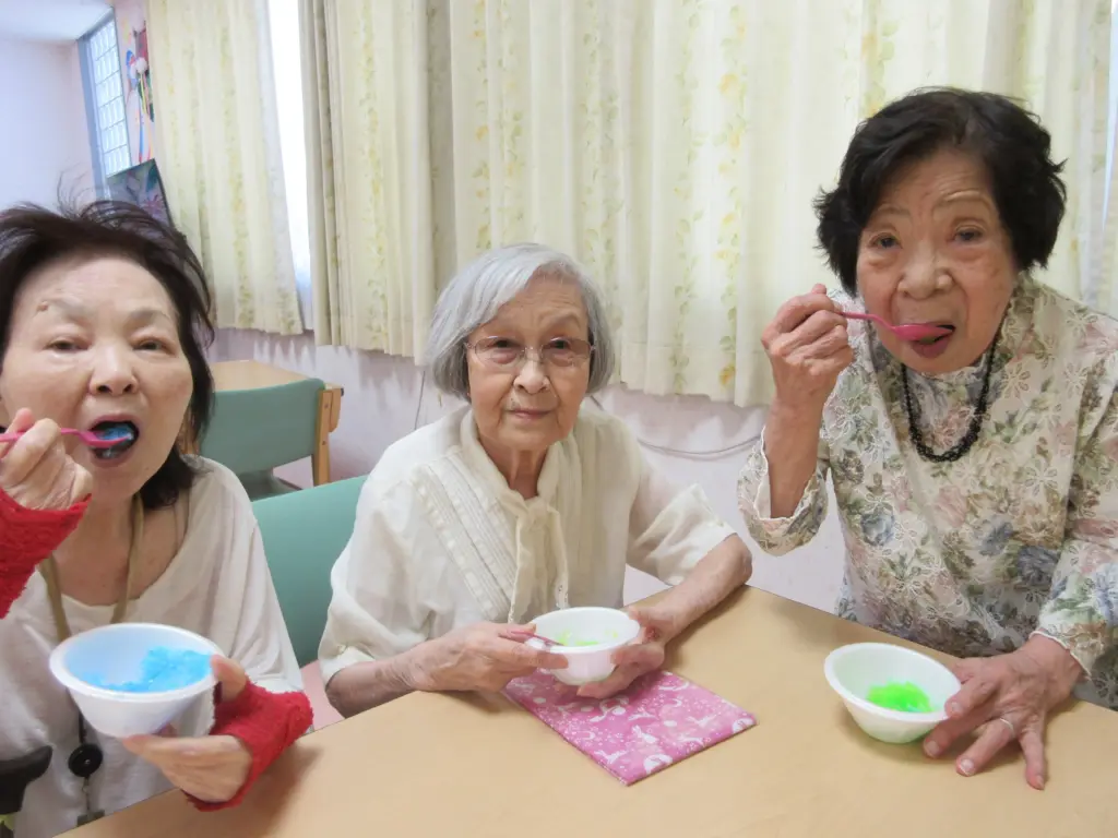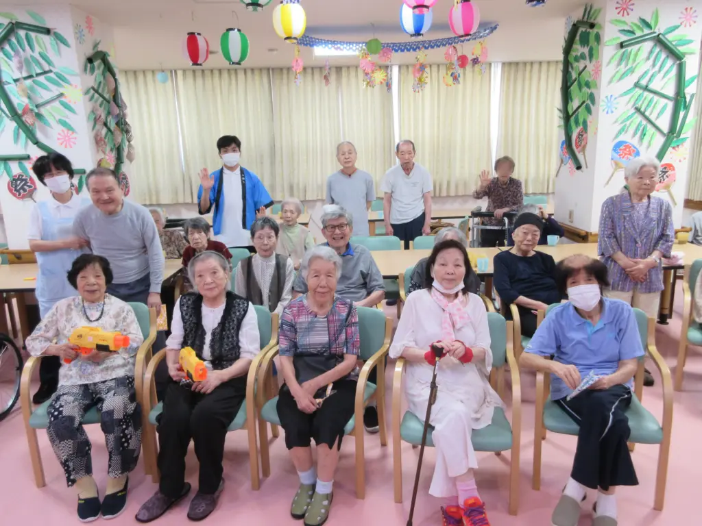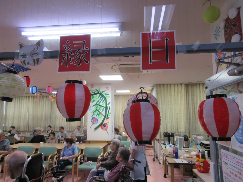 午前中は、各階の居室前を手づくりのお神輿が練り歩きます。昼食にはこの日のための特別メニュー「うな丼」を召し上がっていただき、午後は縁日を開催しました。懐かしい遊びも体験していただき、楽しんでいただけたのが皆さまのお顔から伝わります。