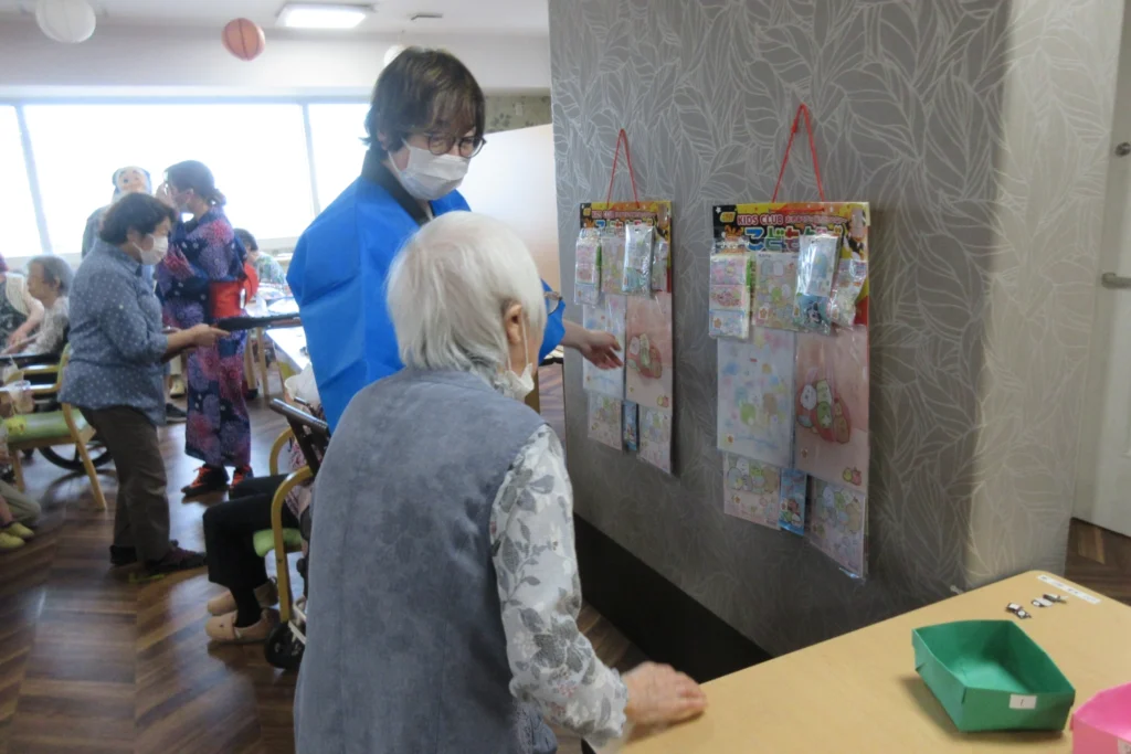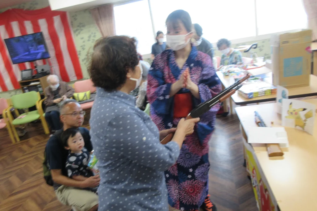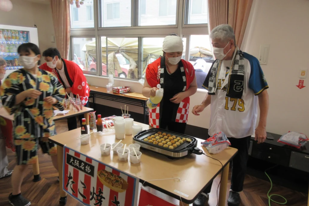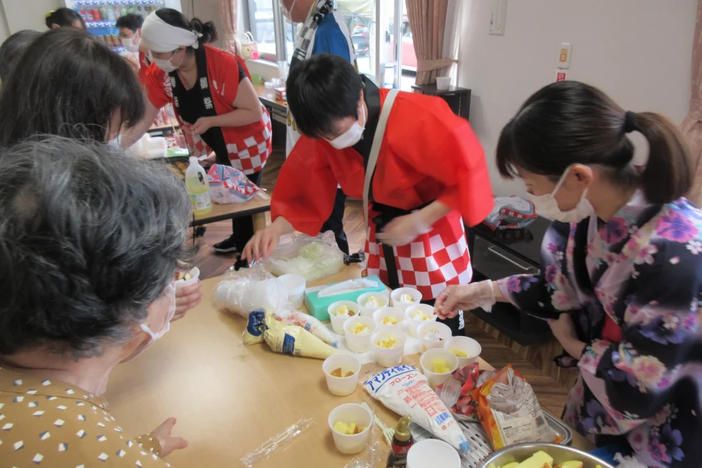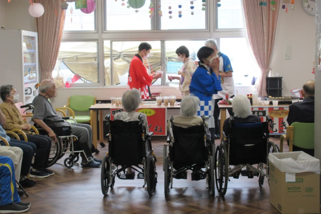 恒例の盆踊りは、ご入居者様に太鼓を叩いていただきます。ご入居者様と職員で輪になって大盛り上がり。今年も沢山の笑顔が見られました!