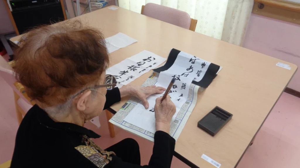 毎月行っている習字のレクリエーション。お手本を元に書かれている姿は真剣そのものです。なかには自由に文章を書かれる方も。