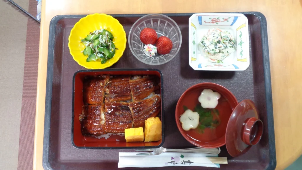 当施設では、季節ごとの楽しみやご入居者様の「美味しいものを食べたい」というお気持ちにお応えするべく、特別なイベント食を企画しています。新鮮なお刺身の盛り合わせ、握りずし、そしてふっくら香ばしいうな重など……。
