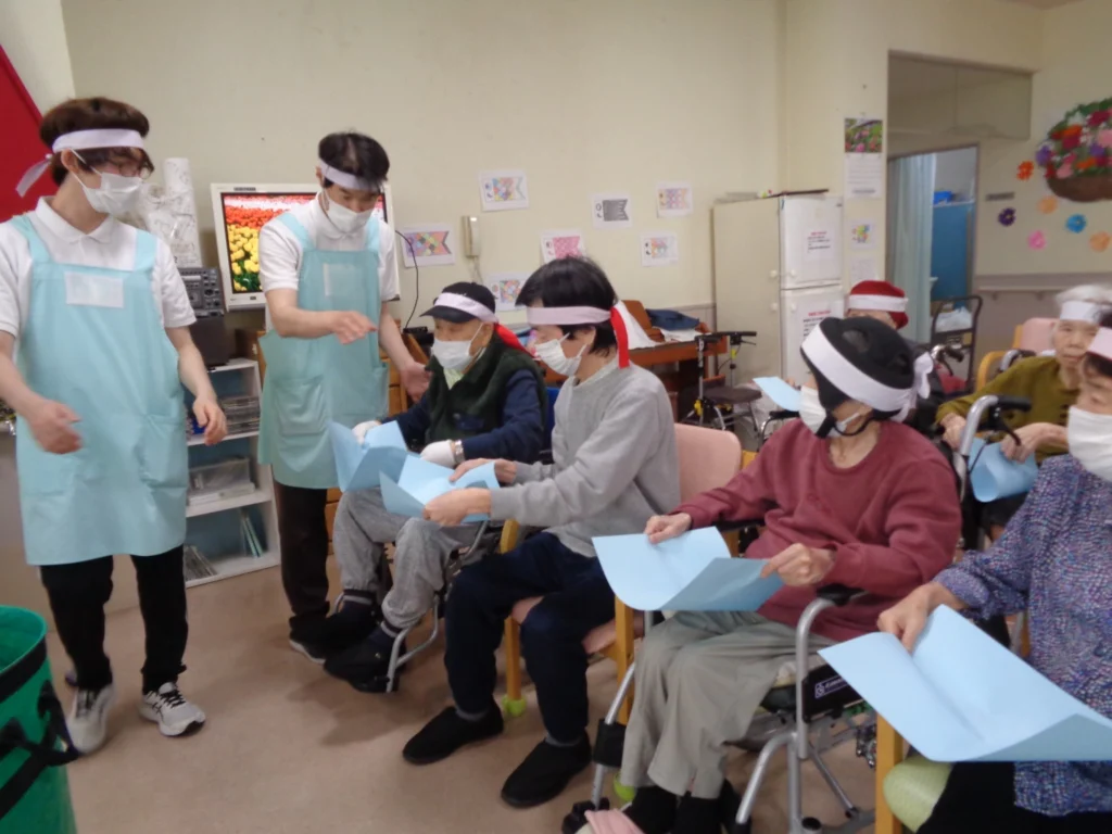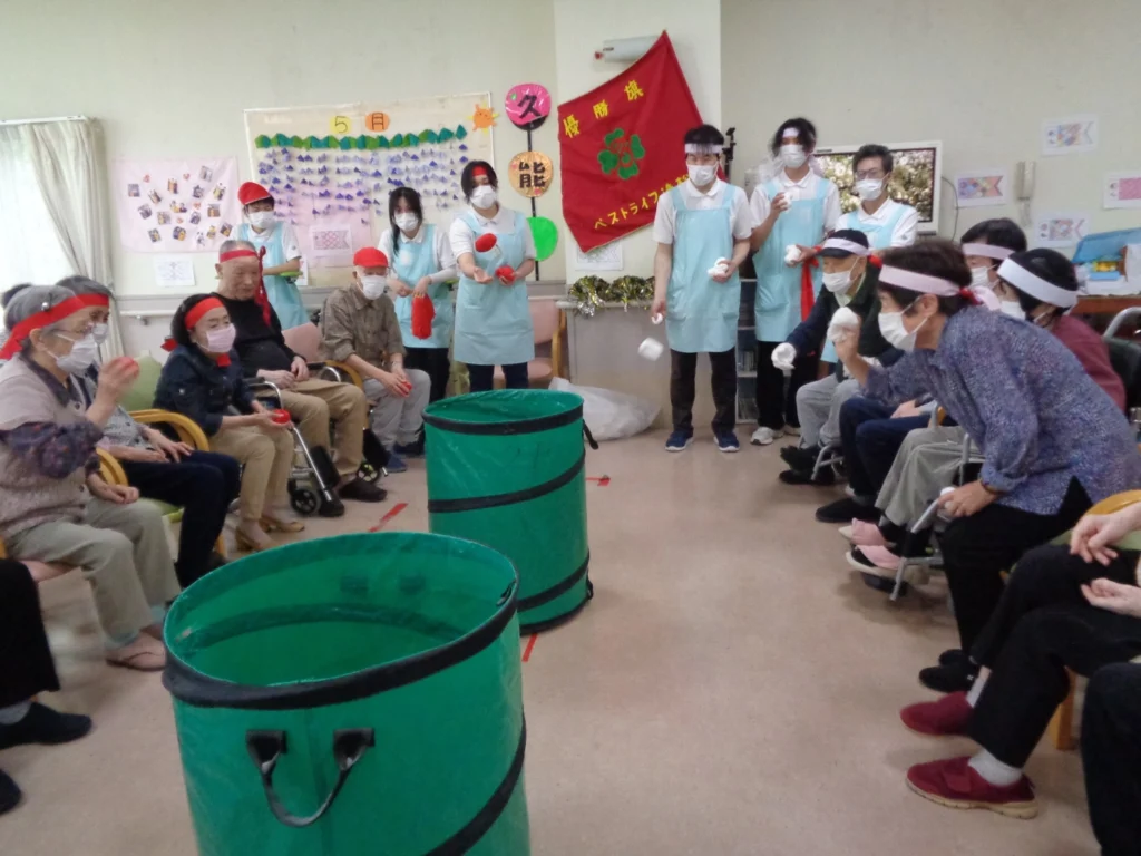 普段はもの静かなご入居者様も、大きな声で声援を送ります。皆さま紅白の鉢巻を身に付け、一生懸命に競技に参加されました。 途中にはしっかりと水分補給のクールダウンタイムを設けます。あちらこちらで笑顔が咲き、今年もとてもよい運動会となりました。