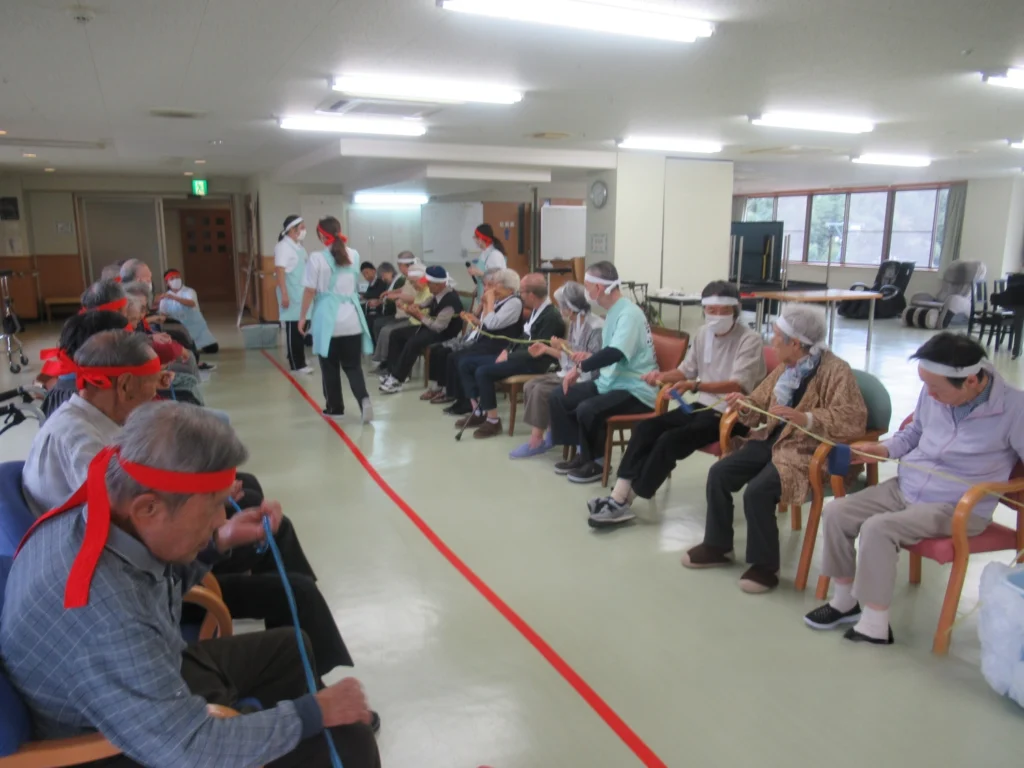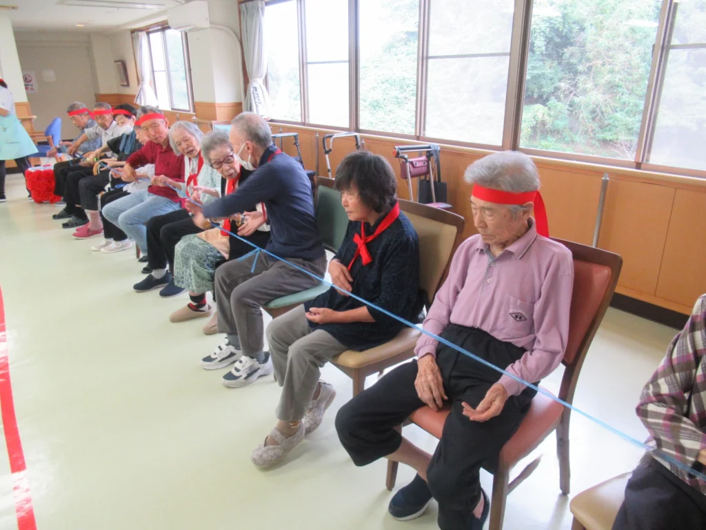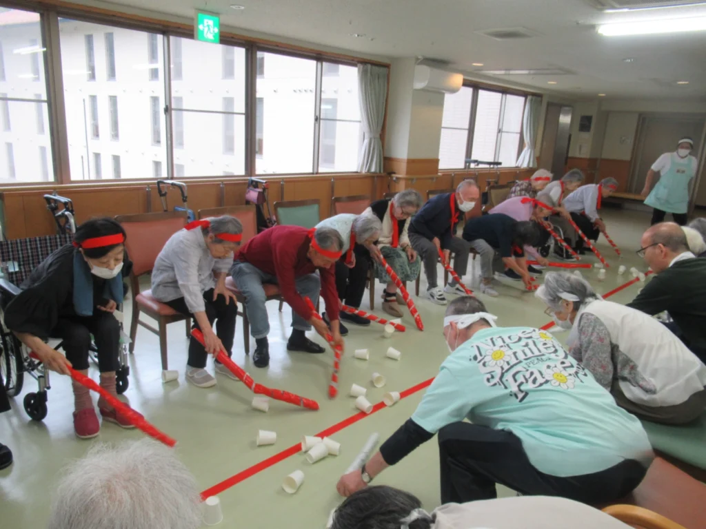 紅白に分かれ、「玉の代わりに紙コップを敵陣により多く入れた方が勝ち!」というもの。“座って参加する”というルールも、夢中になるあまり、皆さま前のめりに…。普段レクリエーションにあまり参加されない方の参加もあり、とても盛り上がった運動会となりました。