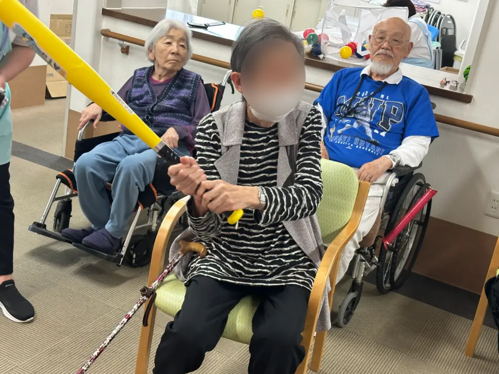 プラスチックのバットで球を打つのはもちろんのこと、実際に走ることは難しいので、万歩計を手で振って盗塁を狙うなどの工夫を凝らし、全身を使った運動を楽しんでいただきました。爽やかな汗がにじむ、楽しい一日となりました。
