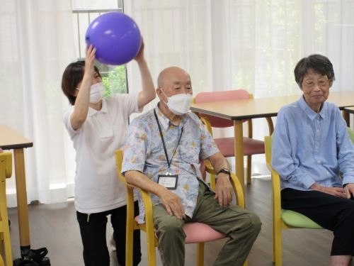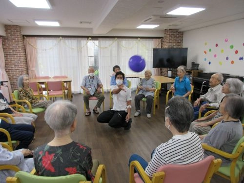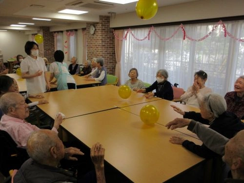 毎月3~4回ほど行っている『風船バレー』はご入居者様にとても好評です。職員も一緒になって楽しめるレクリエーションの一つです。