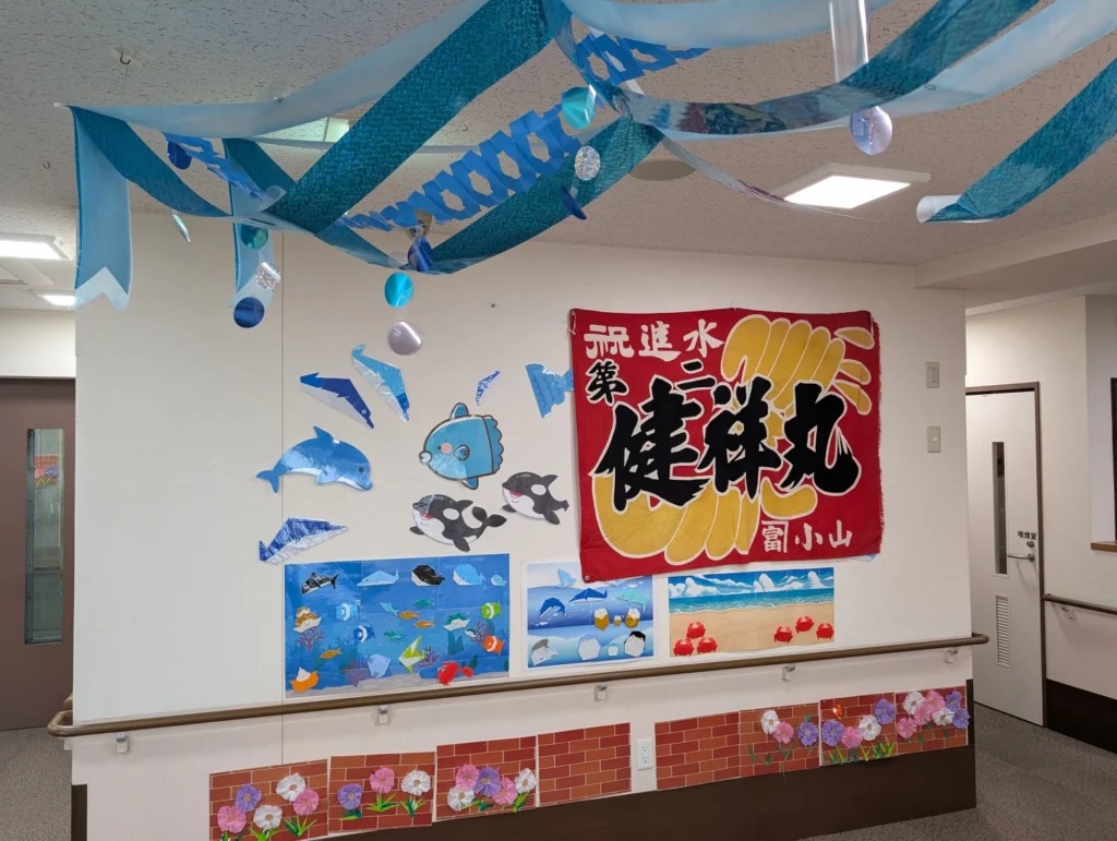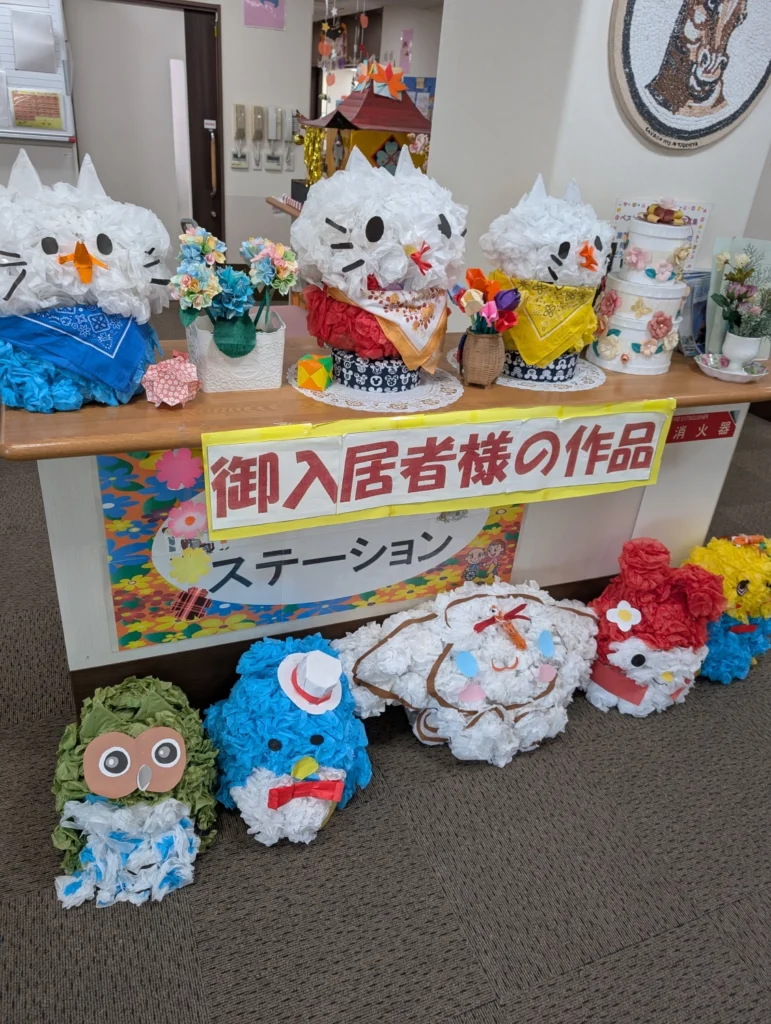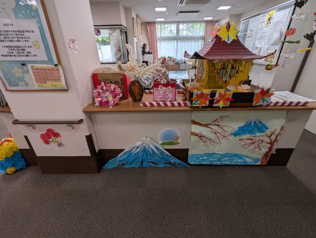 館内でも楽しくお過ごしいただけるように「館内でも四季を感じていただこう」をテーマに館内装飾に力を入れています。月に最低1回は館内装飾のレクリエーションを取り入れています。ご入居者様に花を広げていただく等、お一人おひとりのできる所を手伝っていただき、一緒に装飾を作らせていただいています。