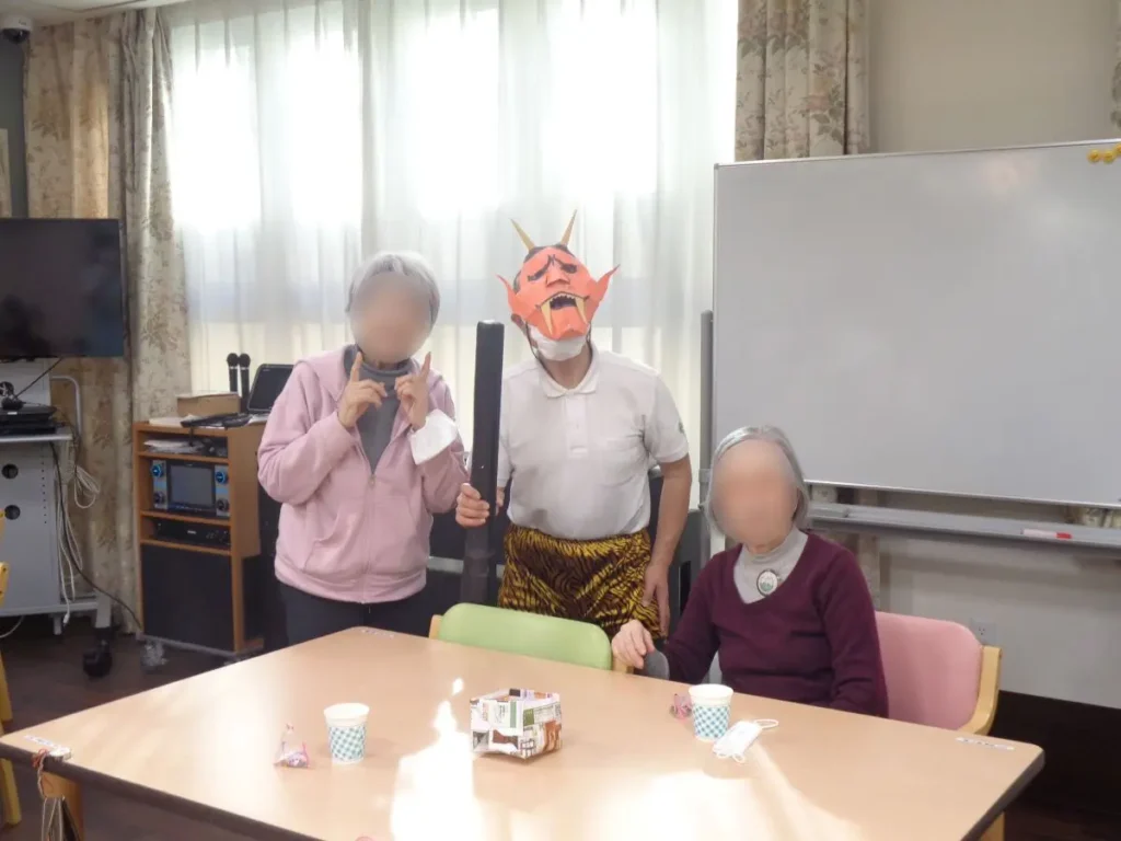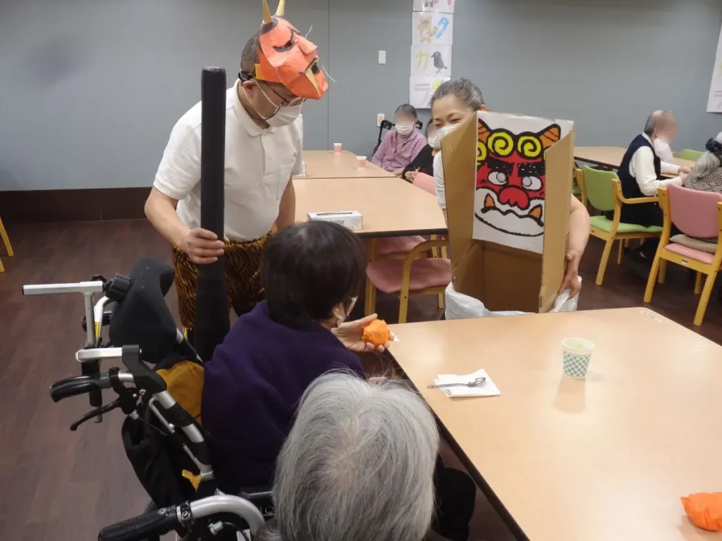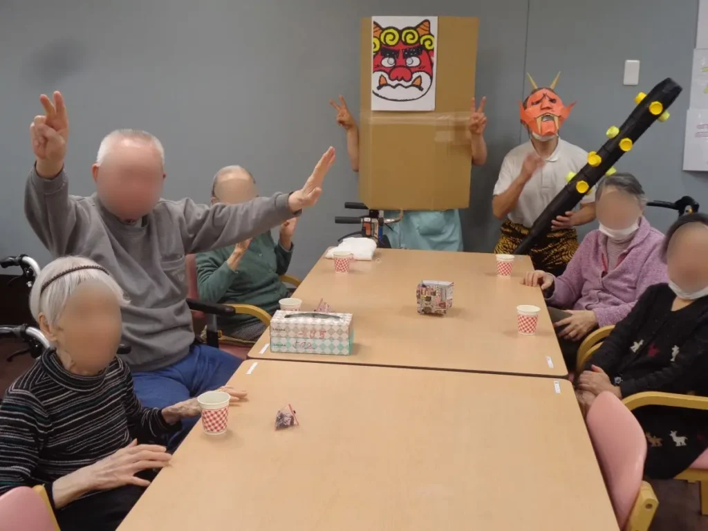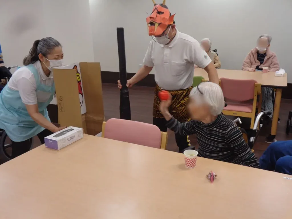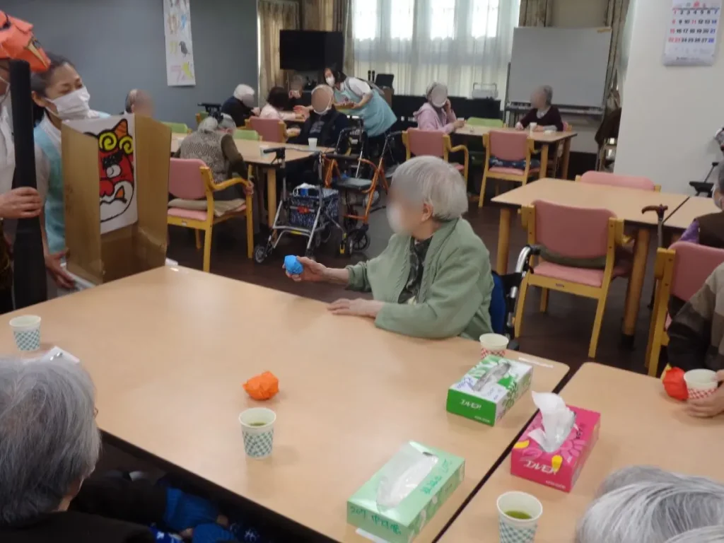 元気な掛け声とともに、豆に見立てた紙製の球をスタッフ扮する鬼に向かって投げます。ご入居者様の笑顔と笑い声に包まれたにぎやかな時間となりました。