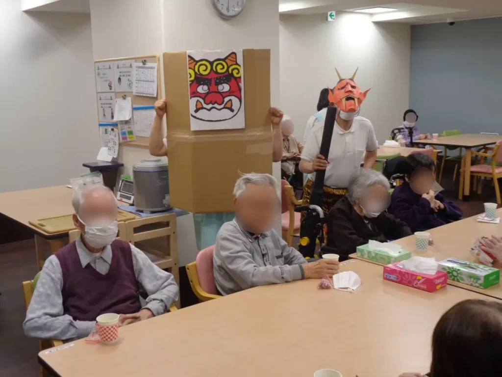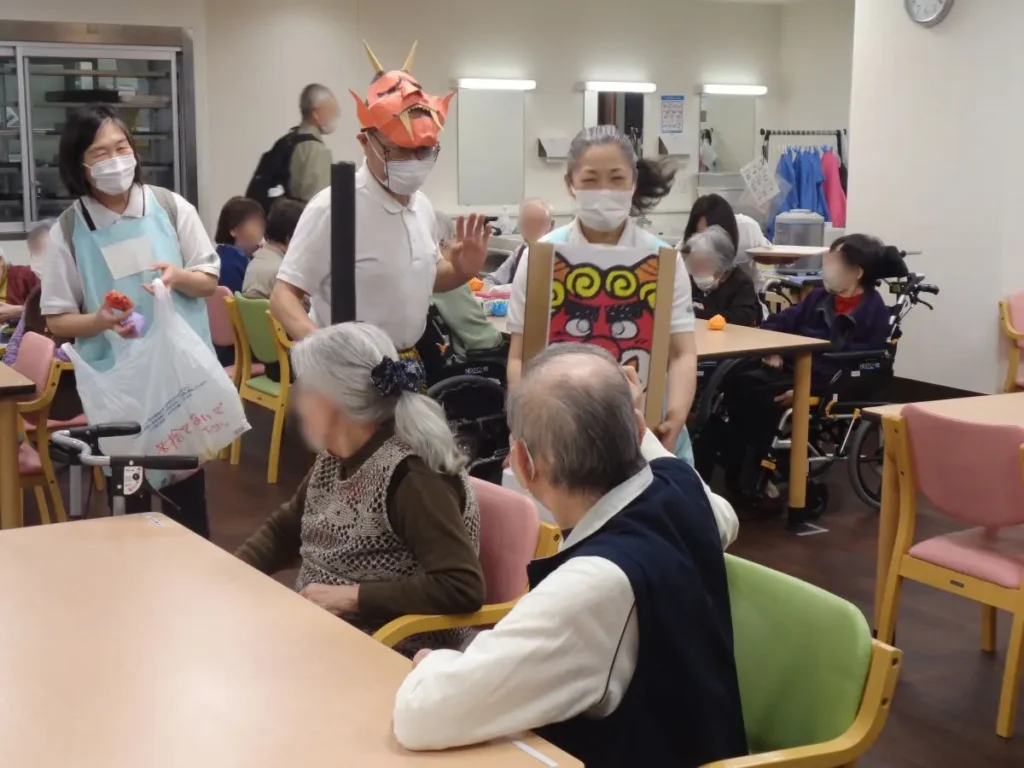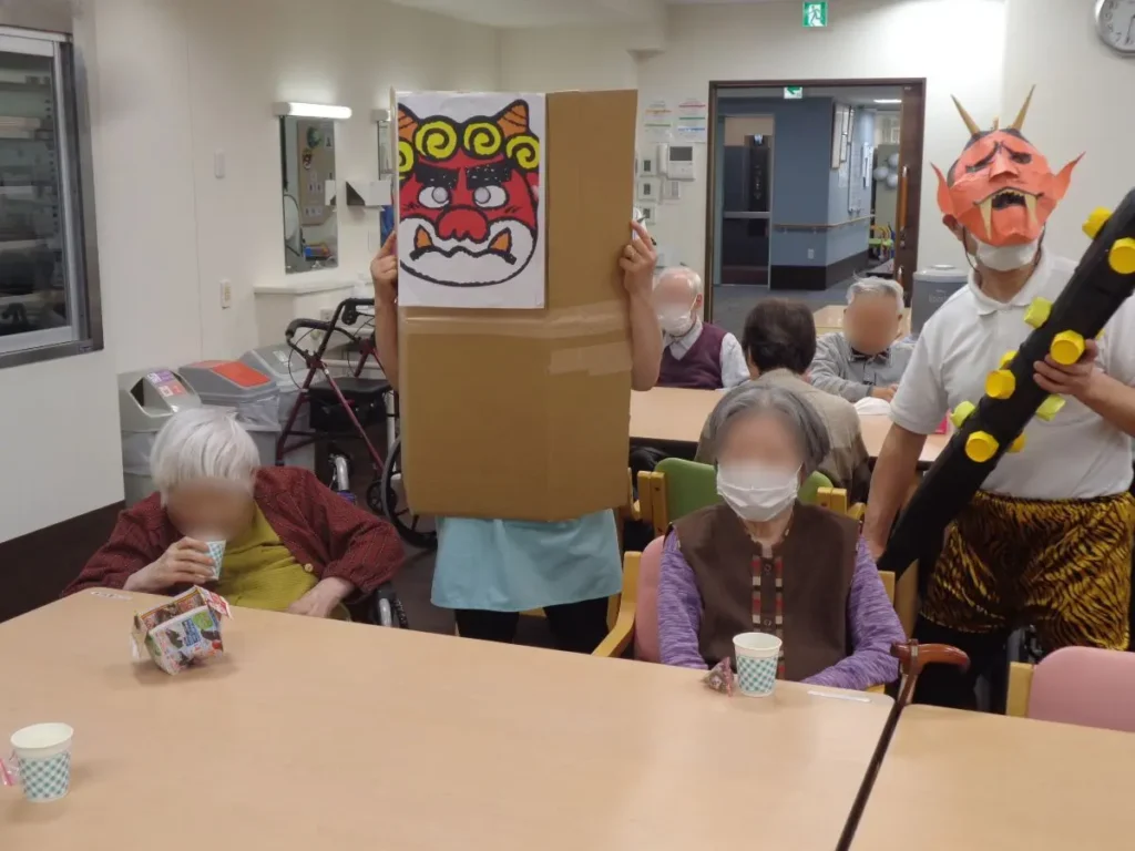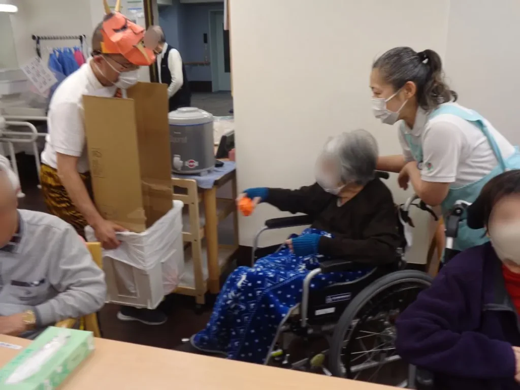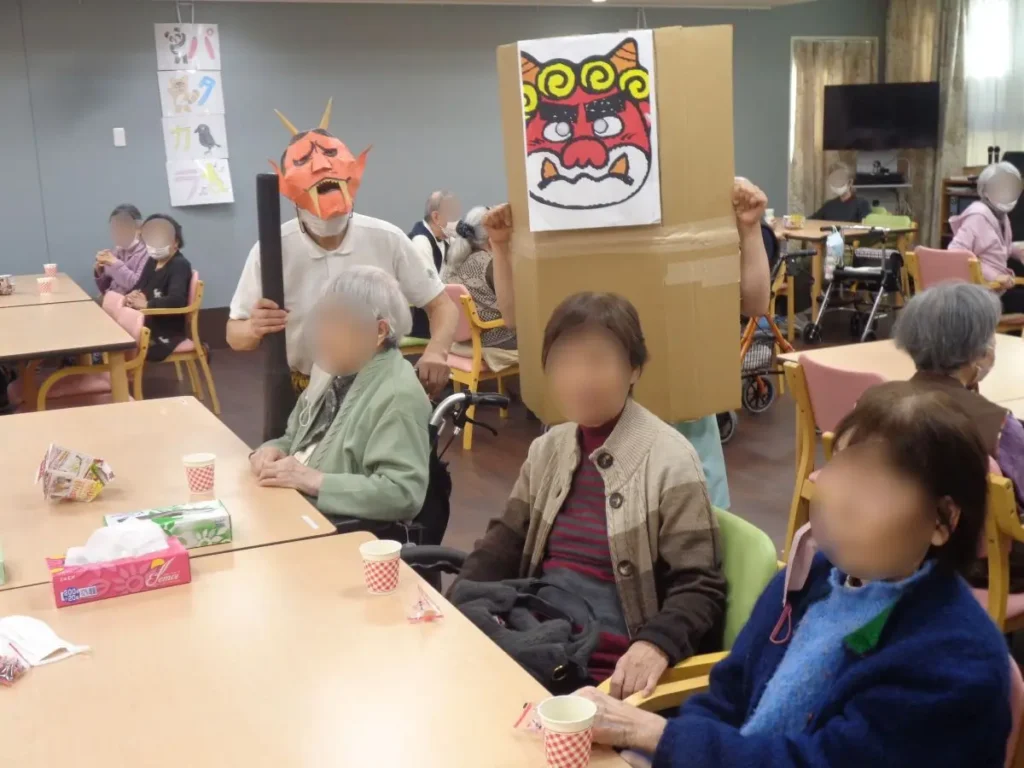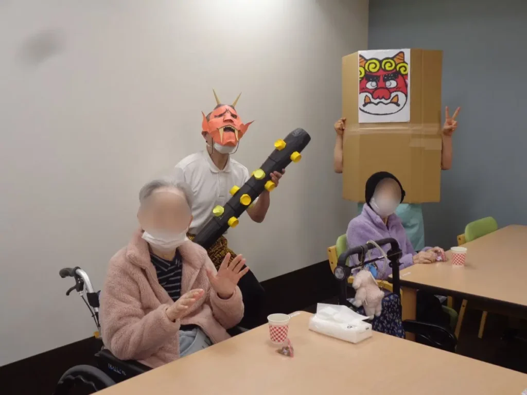 元気な掛け声とともに、豆に見立てた紙製の球をスタッフ扮する鬼に向かって投げます。ご入居者様の笑顔と笑い声に包まれたにぎやかな時間となりました。