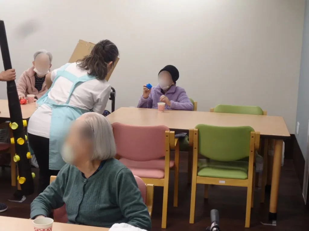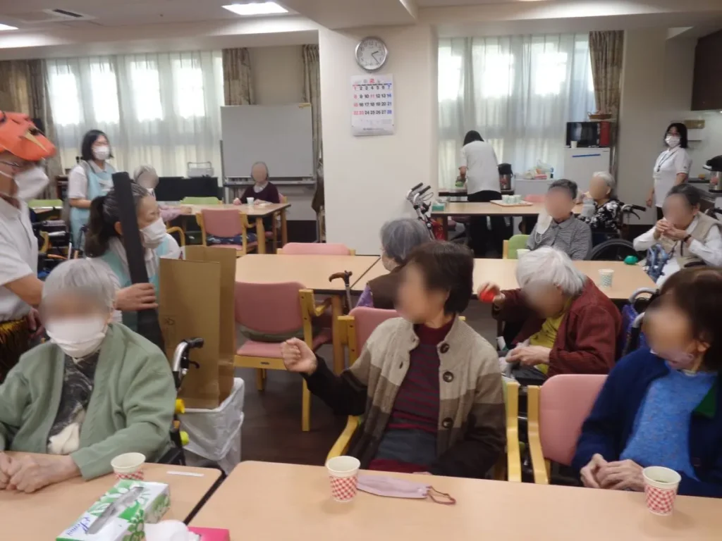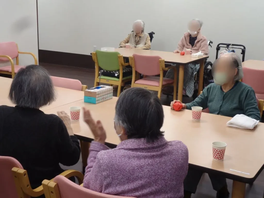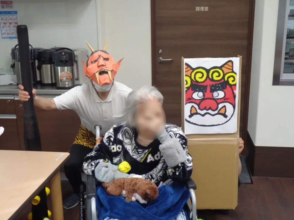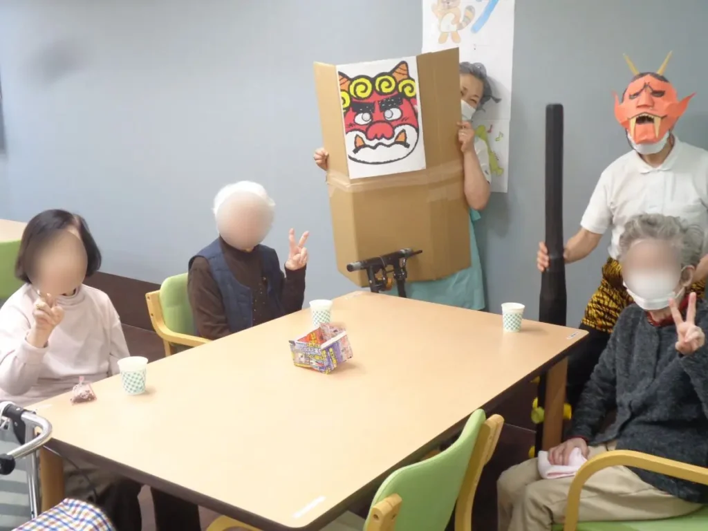 元気な掛け声とともに、豆に見立てた紙製の球をスタッフ扮する鬼に向かって投げます。ご入居者様の笑顔と笑い声に包まれたにぎやかな時間となりました。