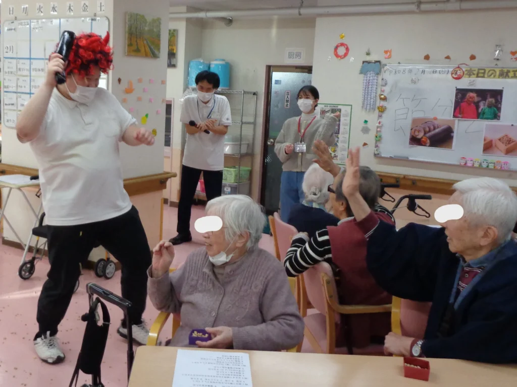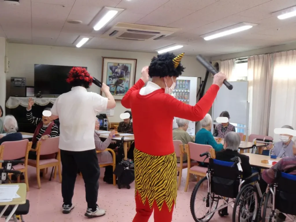 ご入居者様には実際に豆をまいていただき、無病息災を願いながら鬼退治です。中には、豆をこっそりつまみ食いされる方も…(笑)。 施設内には皆さまの明るい声が響き渡りました