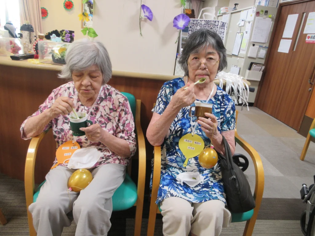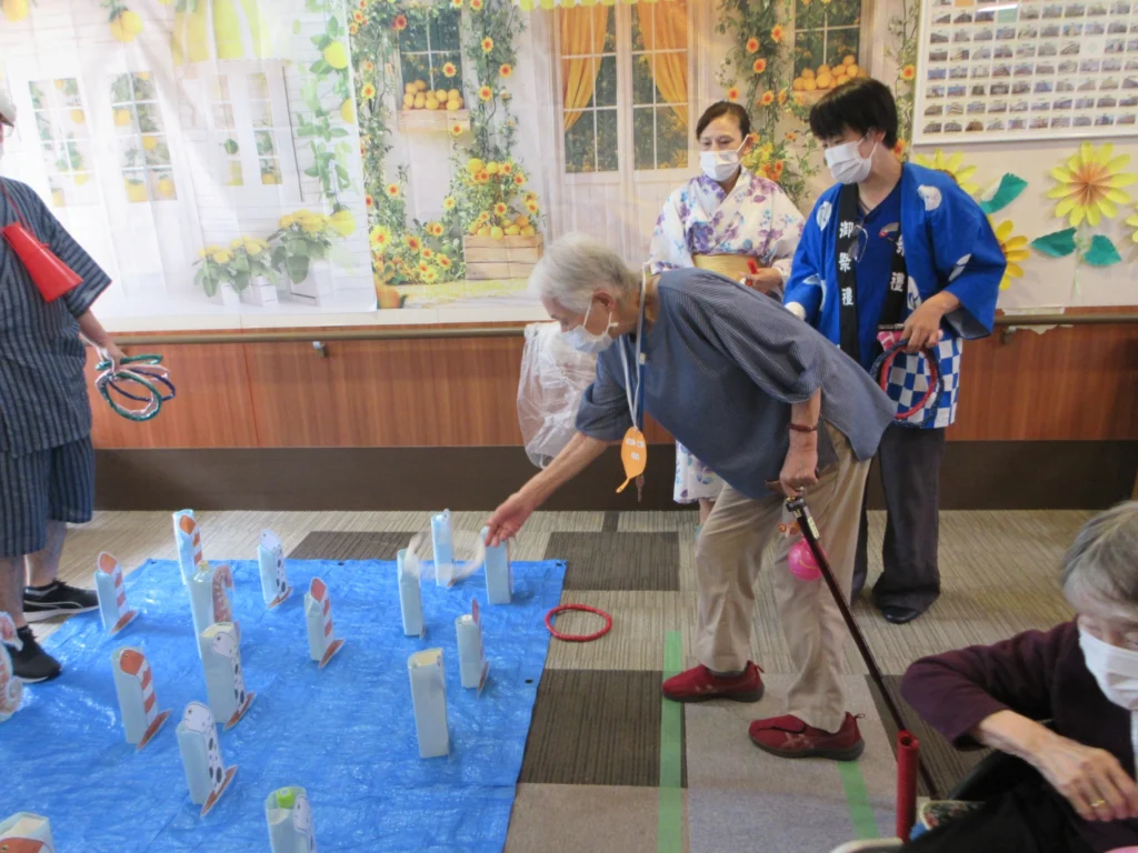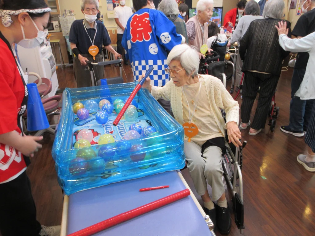 14時より会場では『かき氷』『魚釣り』『輪投げ』『ヨーヨー釣り』をご用意し、普段あまりレクリエーションに参加されないご入居者様も笑顔で楽しまれていました!