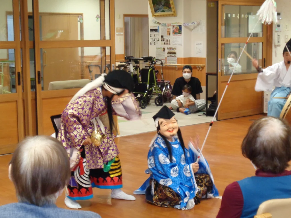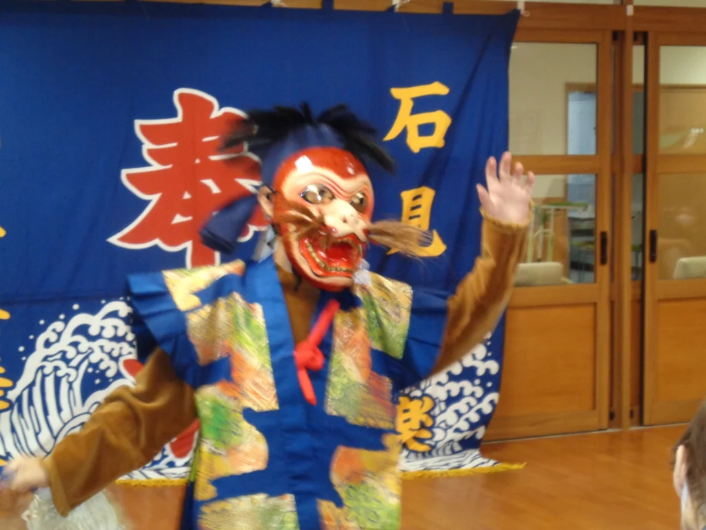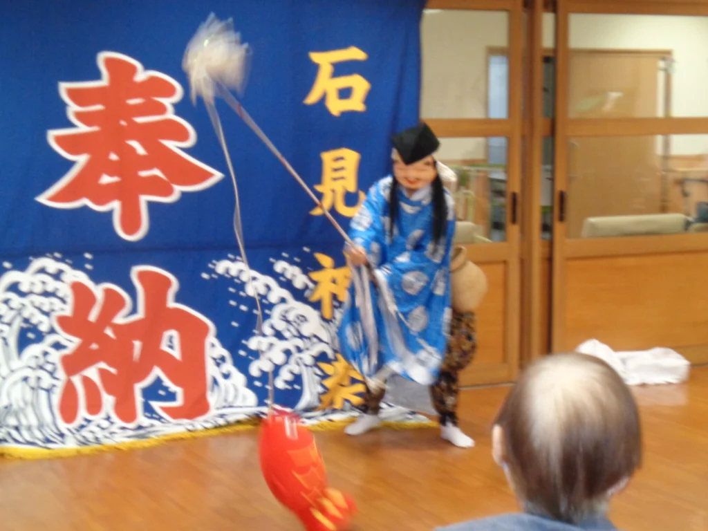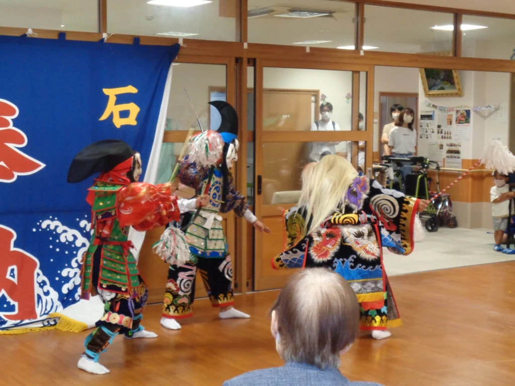 毎年恒例の「納涼祭」ですが、今年は趣向を変えて地域の神楽団をお招きし、2演目を披露していただきました。