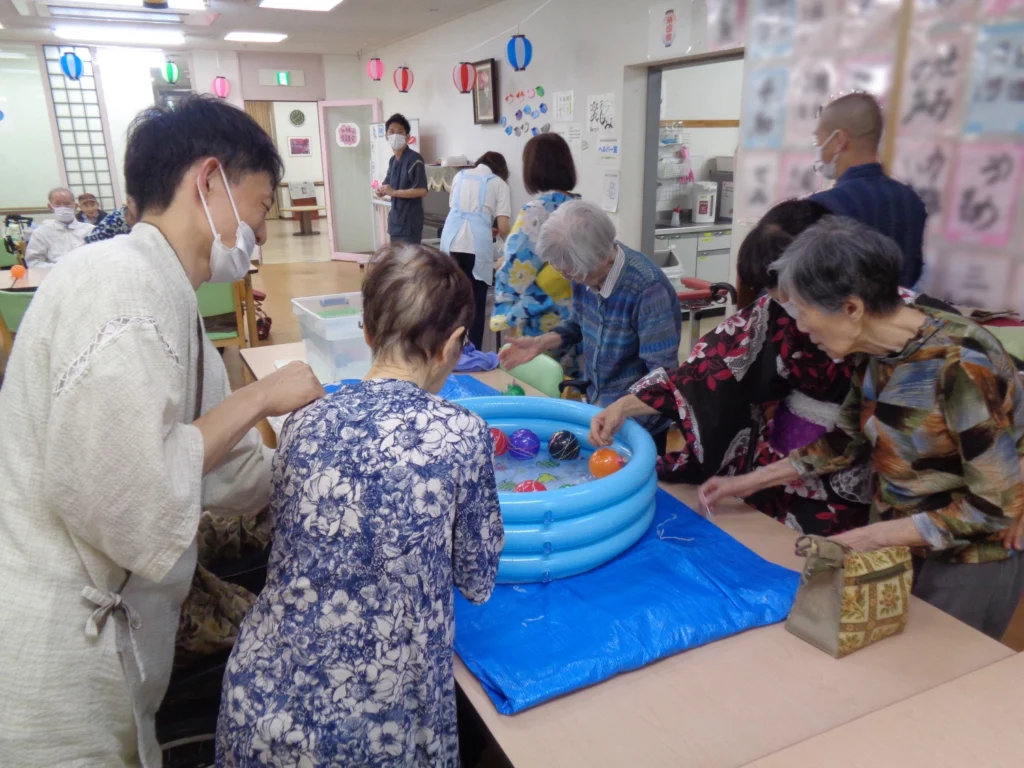 午前中からワクワク。ヨーヨーすくいにドキドキ。「浴衣素敵だね」と言っていただき、職員もウキウキ気分になりました。