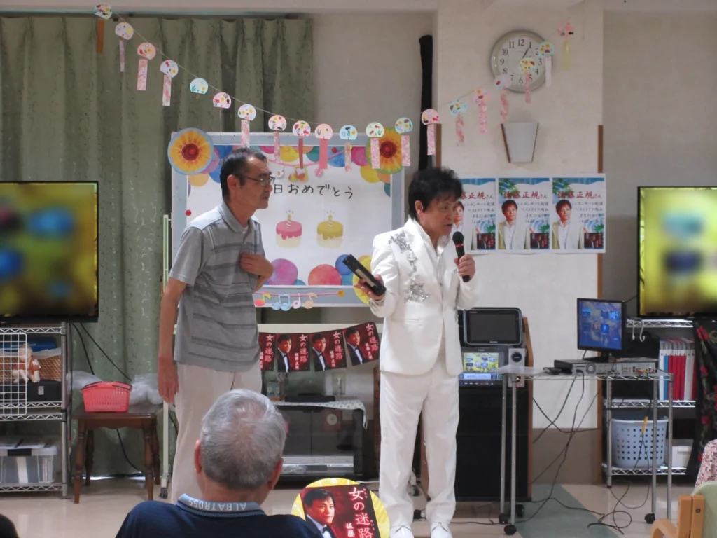 8月の誕生日会には演歌歌手の佐藤正規さんをお招きして、ミニコンサートをしていただきました。