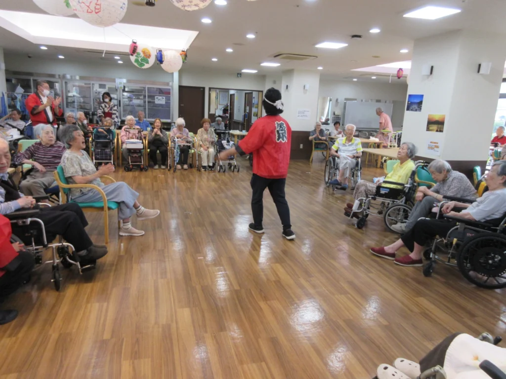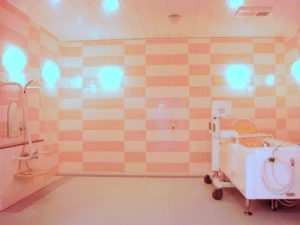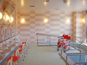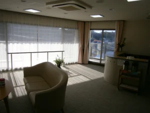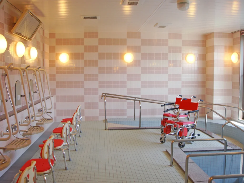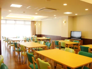 食堂、浴室(一般浴・機械浴・個浴)、ヘルパーステーション、健康管理室、機能訓練コーナー兼談話コーナー、理美容室、相談室、テラス、事務室、洗濯室、トイレ、エレベーター |