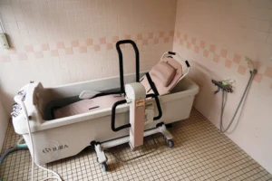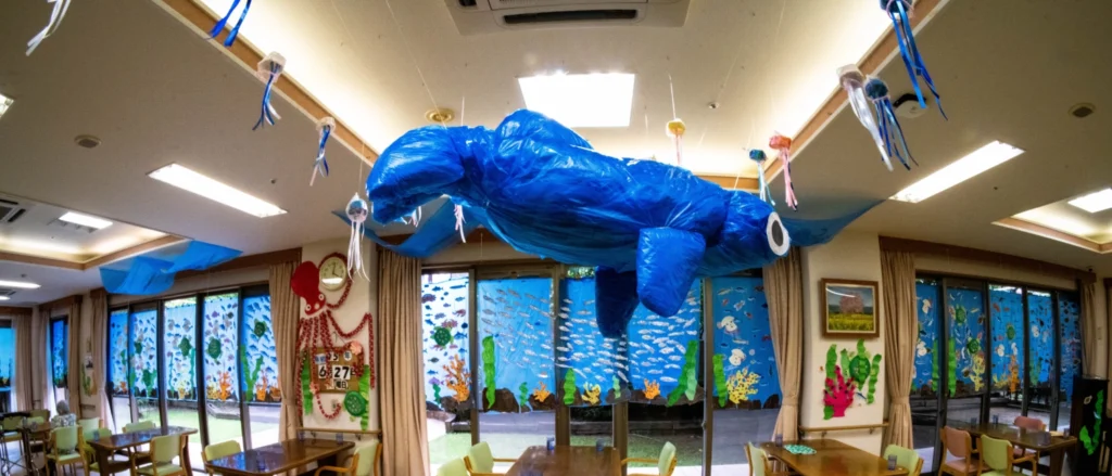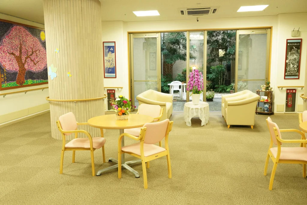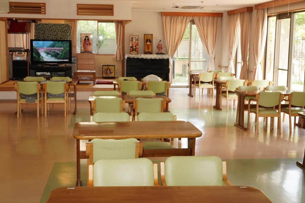 食堂、浴室(一般浴・機械浴・個浴)、ヘルパーステーション、健康管理室、機能訓練コーナー、談話コーナー、理美容室、和室、事務室、洗濯室、トイレ、エレベーター |