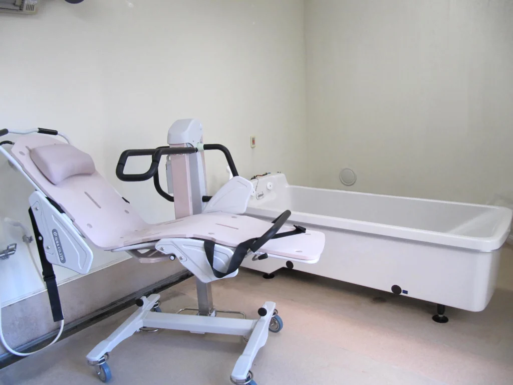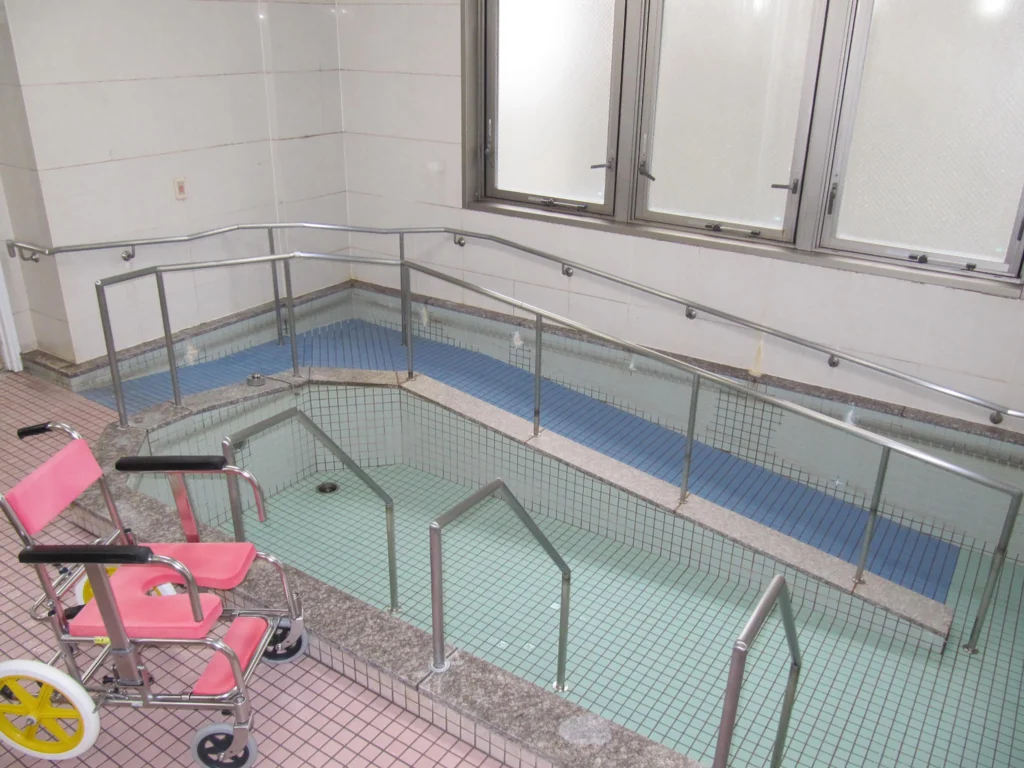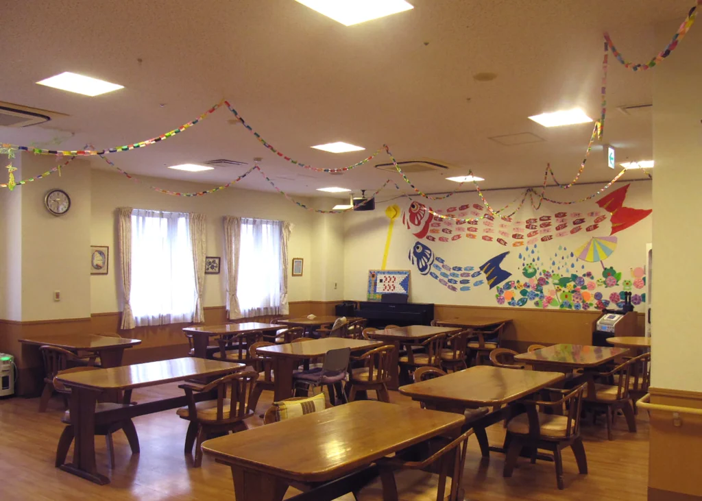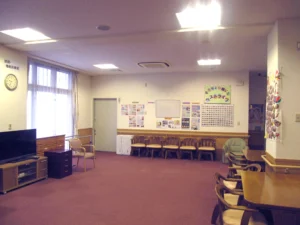 食堂、浴室(一般浴・機械浴・個浴)、ヘルパー室、健康管理室兼一時介護室、機能訓練室兼談話スペース、理容室、生活相談室、事務室、洗濯室、トイレ、エレベーター |