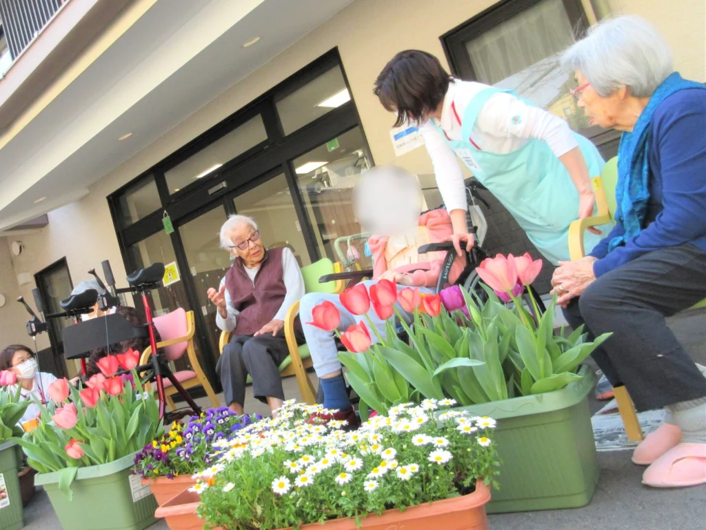 世界遺産・仁和寺に近く、ご家族様と散歩にお出かけになることも。館内にはご入居者様と一緒に作成した四季折々の作品を多く展示され、明るいスタッフが笑顔でお迎えします。共有スペースでの交流も盛んな、賑やかな施設です。