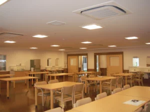 食堂兼機能訓練室、浴室(一般浴・機械浴・個浴)、ヘルパー室、健康管理室、談話コーナー、理容室、相談室、事務室、洗濯室、トイレ、エレベーター |