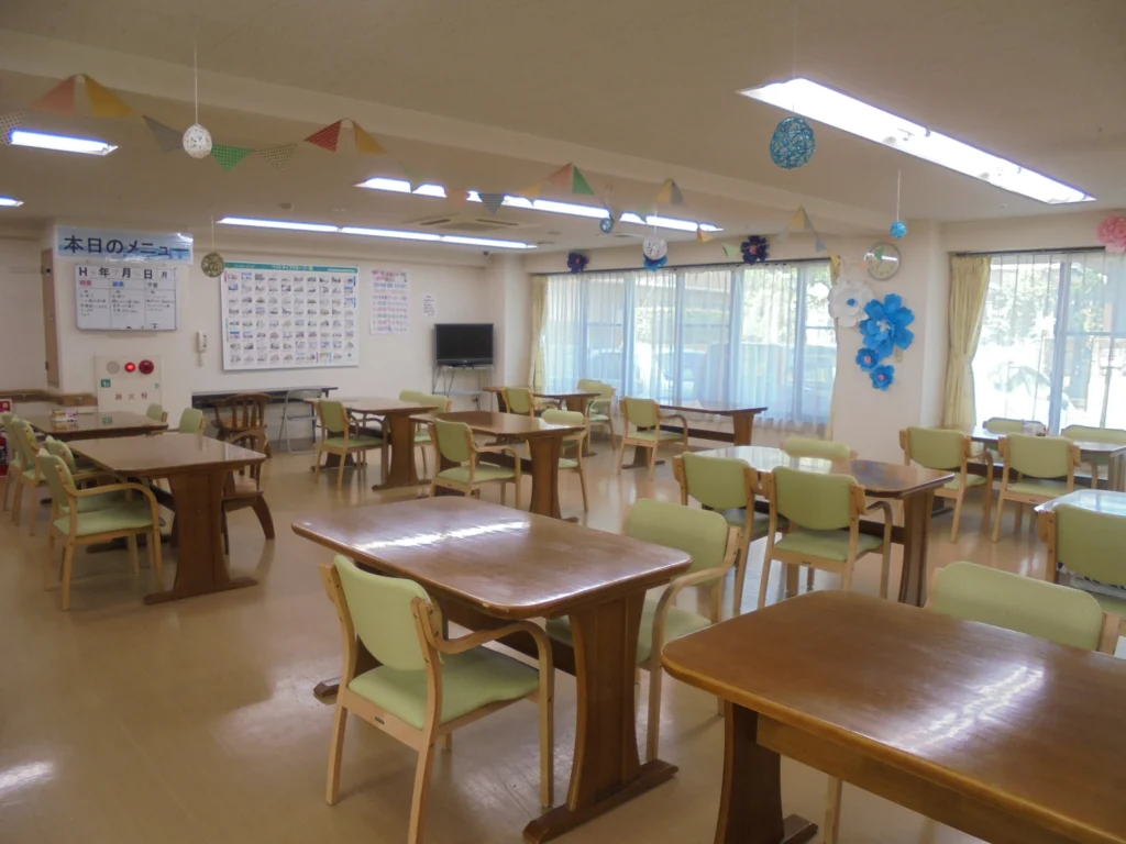 共用施設・設備 食堂、浴室(一般浴・機械浴・個浴)、ヘルパーコーナー、健康管理室、機能訓練室、談話コーナー、理美容室、相談室、ゲストルーム、事務室、洗濯室、トイレ、エレベーター