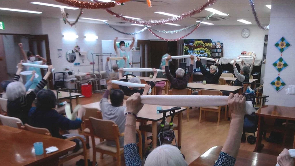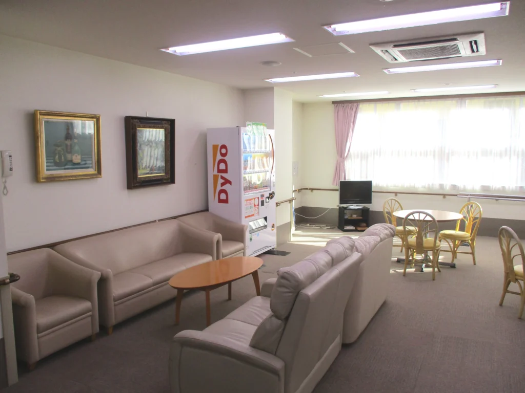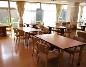 食堂、浴室(一般浴・機械浴・個浴)、ヘルパーステーション、健康管理室、機能訓練室兼多目的ホール、談話コーナー、美容室、生活相談室、事務室、洗濯室、トイレ、エレベーター |