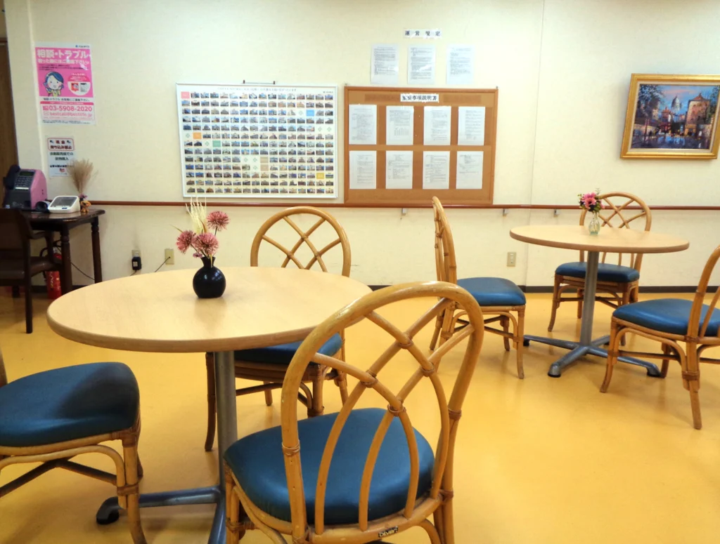 食堂、浴室(一般浴・機械浴)、ヘルパー室、健康管理室兼一時介護室、機能訓練室、談話室、事務室、洗濯室、トイレ、エレベーター |