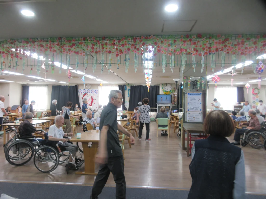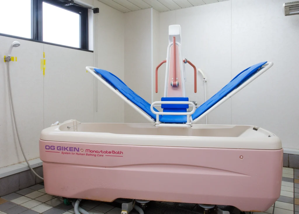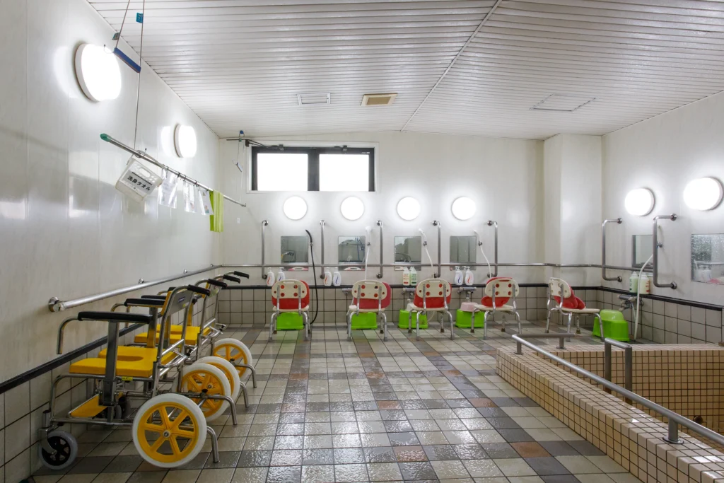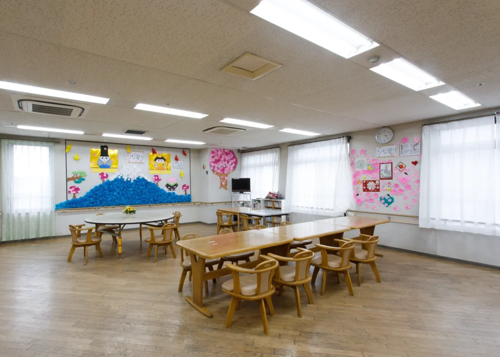 食堂、浴室(一般浴・機械浴)、ヘルパー室、健康管理室兼一時介護室、機能訓練室、談話コーナー、理美容室、事務室、洗濯室、トイレ、エレベーター |