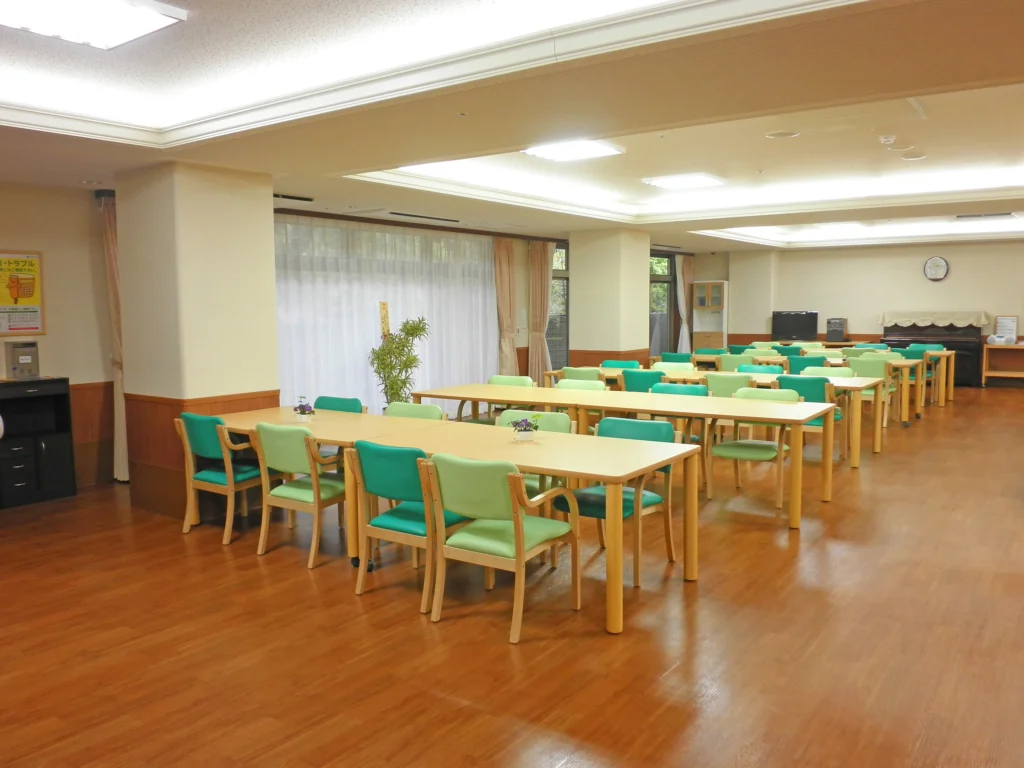 | 共用施設・設備 | 食堂、浴室(一般浴・機械浴・個浴)、ヘルパー室、健康管理室、機能訓練コーナー兼談話コーナー、談話コーナー、理容室、相談室、一時介護室、ゲストルーム、事務室、洗濯室、トイレ、エレベーター |