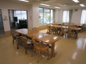 食堂、浴室(一般浴・機械浴)、ヘルパーステーション、健康管理室、機能訓練コーナー、談話コーナー、生活相談室、一時介護室、事務室、洗濯室、トイレ、エレベーター |