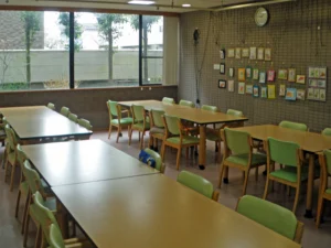 食堂、浴室(一般浴・機械浴)、ヘルパー室、健康管理室兼一時介護室、機能訓練室、談話室、多目的室、事務室、洗濯室、トイレ、エレベーター |