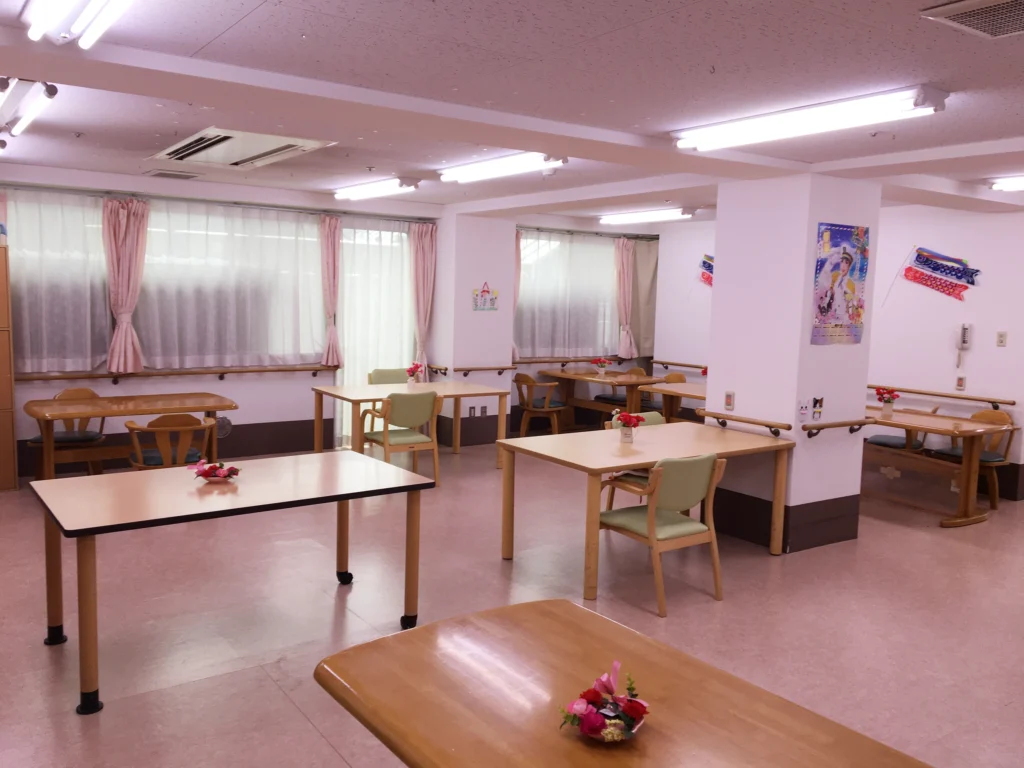 食堂、浴室(一般浴・機械浴)、ヘルパー室、健康管理室、機能訓練コーナー兼多目的コーナー、談話コーナー、事務室、洗濯室、トイレ、エレベーター |